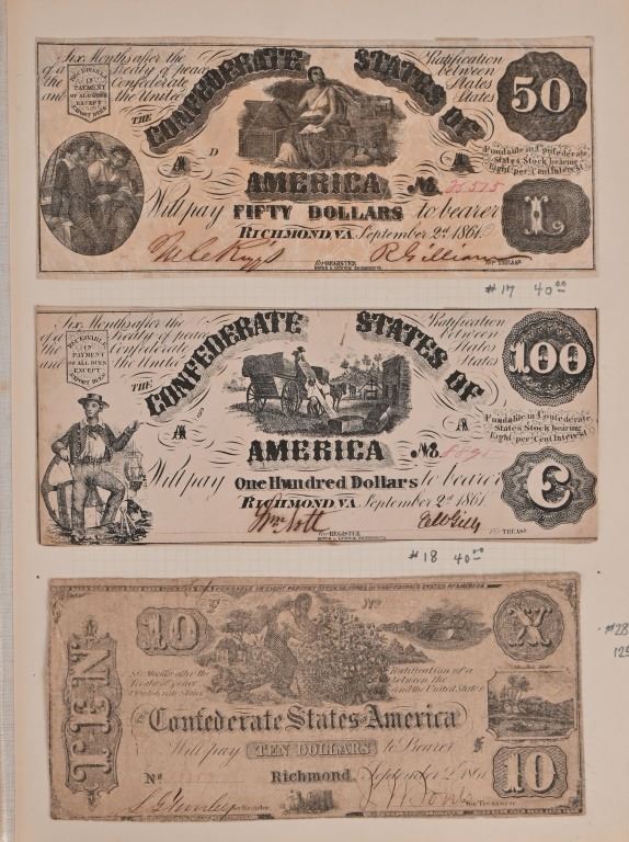 Large collection of currency and tax receipts in Postage Stamp Album from Scott Stamp & Coin Co. New York.