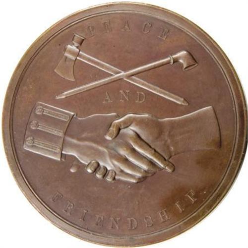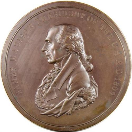 <B>Large, Thick James Madison Indian Peace Medal, Julian IP-5, First Size, First Reverse MS64 NGC.</B></I> Bronzed copper, 76 mm, 262.9 gm (4,057 gn), rim 7.1 mm. A large-sized and thick example of this early Indian Peace medal portraying President James Madison. Signed "R" on obverse rim below bust. One this heavy was absent from the Ford sale (Stack's, Part XVIII, 5/2007), which had a Choice AU bronzed copper First Size, First Reverse with rim 5.4 mm-6.0 mm and weighing 3,215.3 gn. The present example shows still-lustrous medium-brown and red-brown semiprooflike fields with some light obverse spotting and a couple of small lacquered areas on the reverse. <BR><BR><b>Shipping:</b> Coins & Currency (<a target="_blank" href="http://www.heritageauctions.com/common/shipping.php">view shipping information</a>)