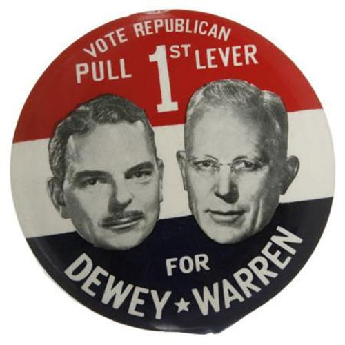 <B>Large Thomas Dewey and Earl Warren Presidential Jugate Campaign Button,</B></I> 3 1/2, Vote Republican Pull 1st Lever, slight edge flaw @6:00, a colorful jugate. Fine. <BR><BR><b>Shipping:</b> Miscellaneous Collectibles, Smal (<a target="_blank" href="http://www.heritageauctions.com/common/shipping.php">view shipping information</a>)