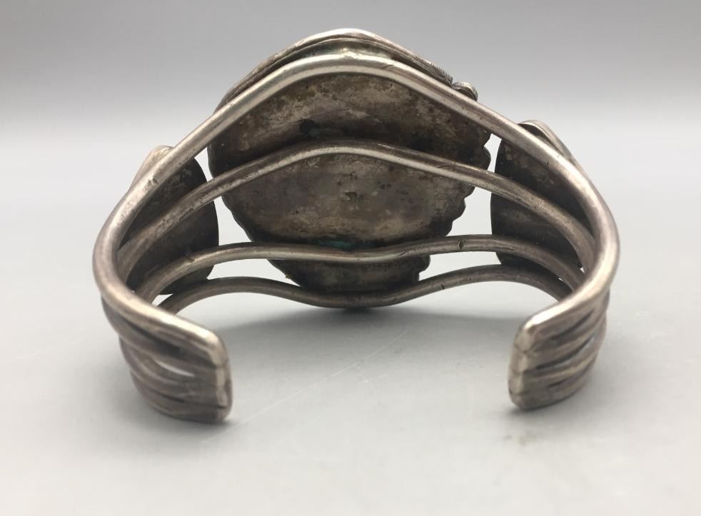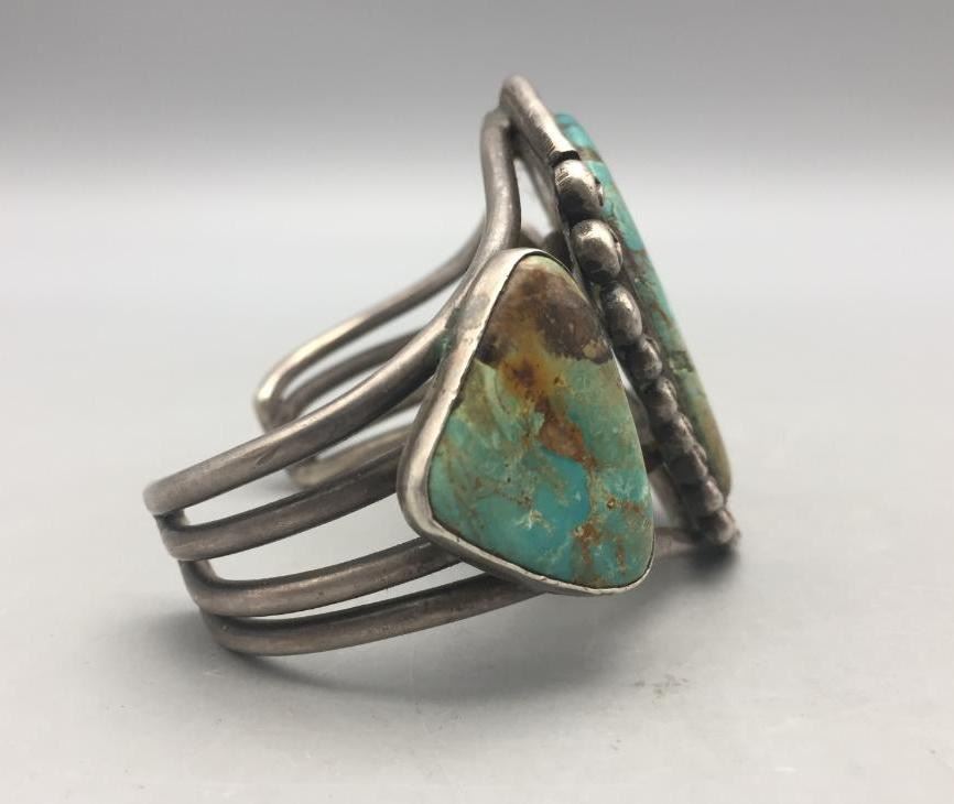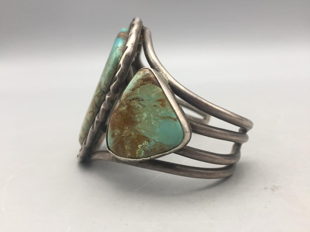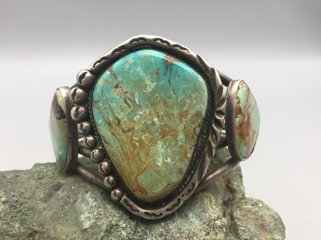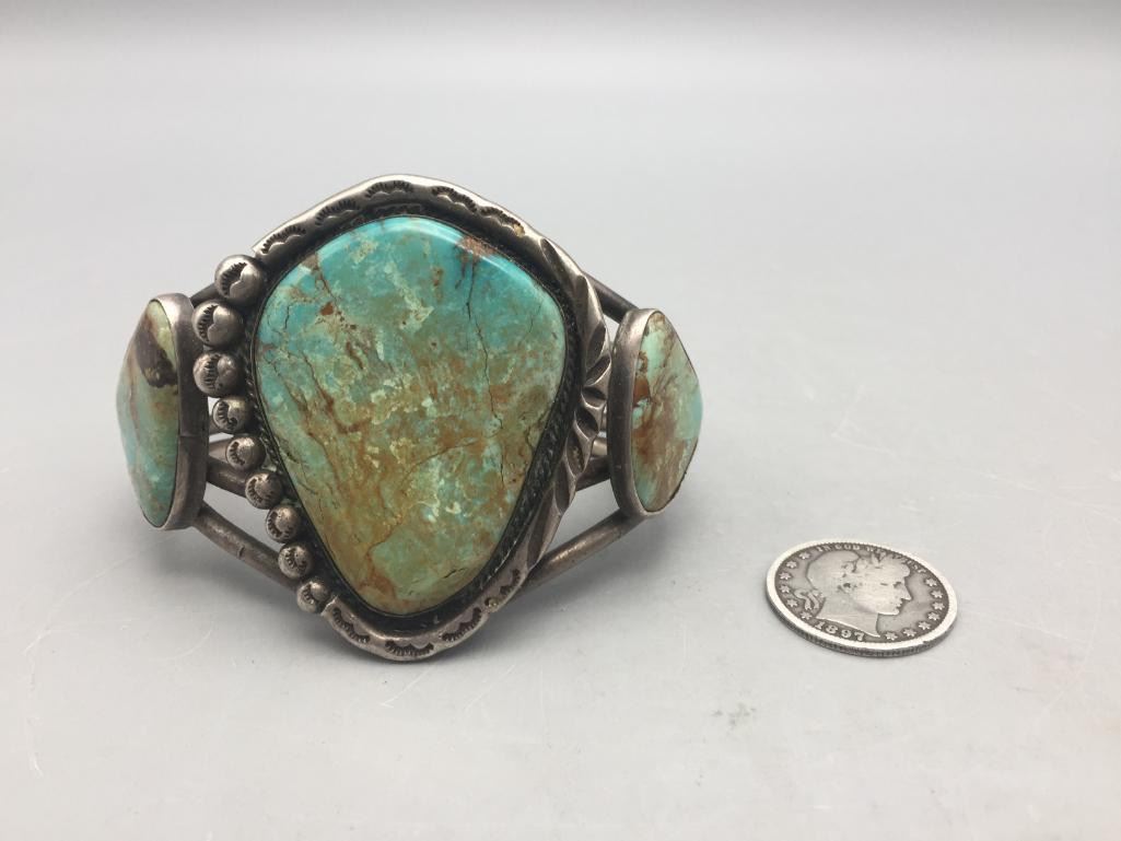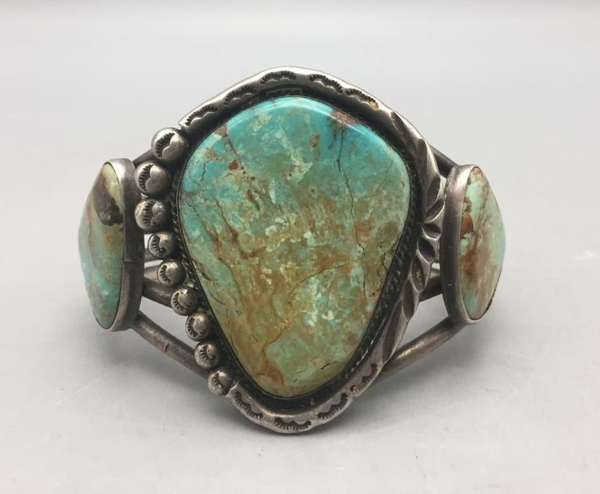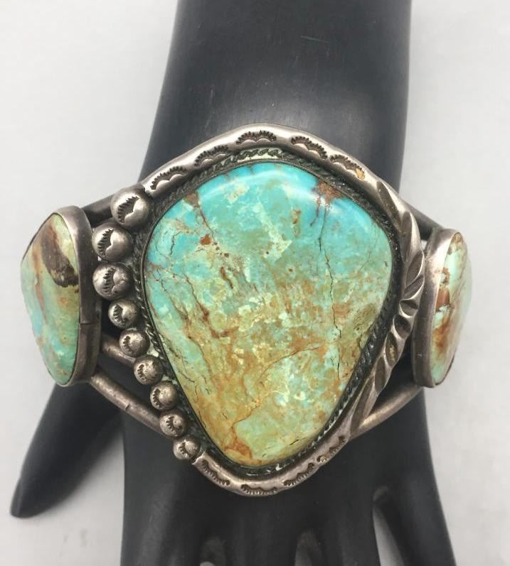 For sale in this lot is a large three stone turquoise bracelet set with beautiful green turquoise and accented with stamped silver work around the middle stone. Maker: Unmarked. Approx. Age: Vintage. Size: Inside circumference measures 6". Opening is an additional 1-1/2", fitting a 7-1/2" wrist. Width is 2-3/8". Weighs 105.2 grams. Condition: Good for its age, normal wear expected. Please look closely at the pictures - they are an important part of our description. Shipping: There will be a $5 handling, packaging fee for shipping this lot. The actual cost of postage will be added on top of that.
