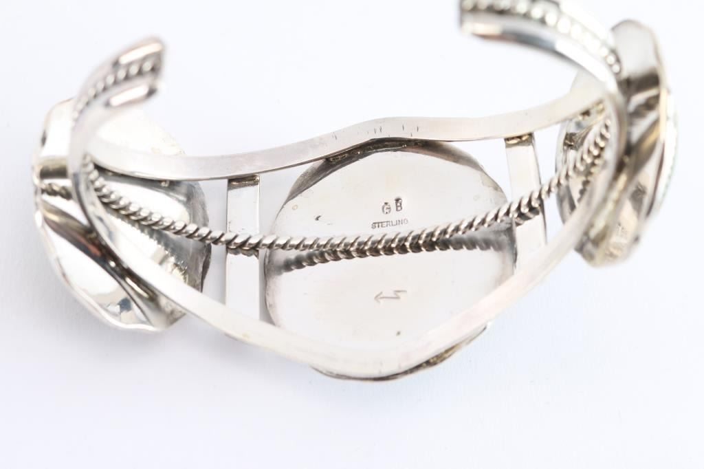 gorgeous number 8 Turquoise in a handcrafted Sterling display. Deep, rich color color with lots of matrix, these cabs are accented with twist wire rope, leaves & star-bursts. The bracelet is 1-3/4" wide at the center and then it tapers to the back. For wrist sizes 6-1/2" to 8". L. Stamped Sterling & hallmarked.