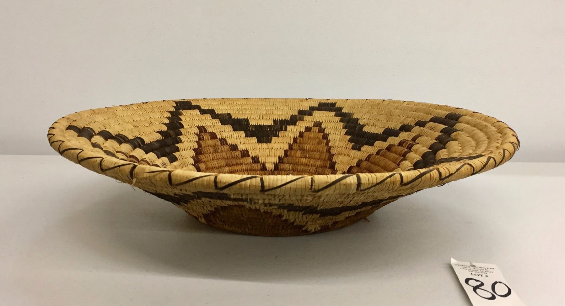 Description: Very large Tohono O’Odham basket. Maker: Unknown Tohono O’odham weaver. Approx. Age: Circa 1960s. Size: 25 3/8” across x 5 1/2” deep. Condition: Pretty good for its age, normal wear and fading expected. Please look closely at the pictures - they are an important part of our description. Shipping: There will be a $10 handling / packaging fee for shipping this lot. The actual cost of postage will be added on top of that.