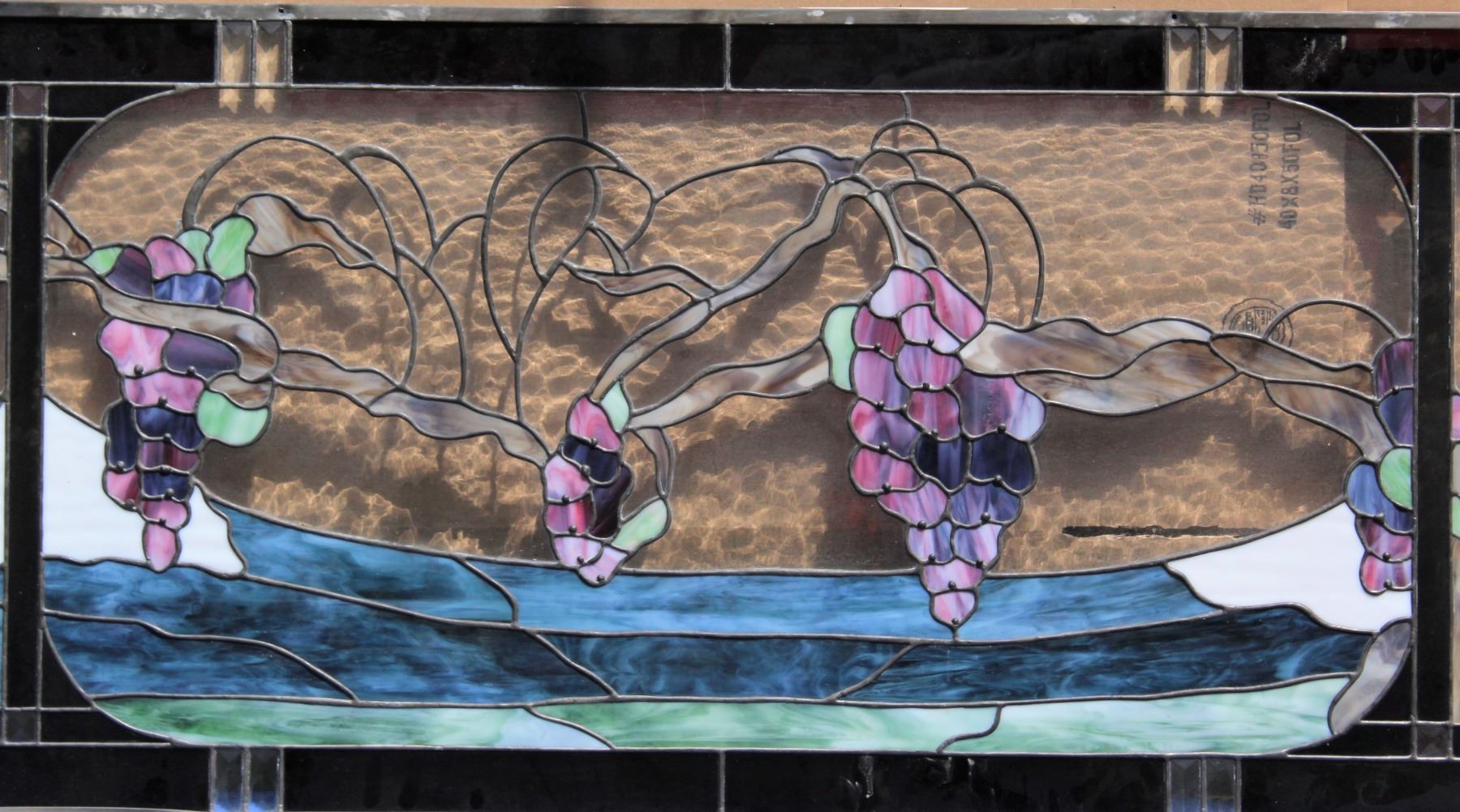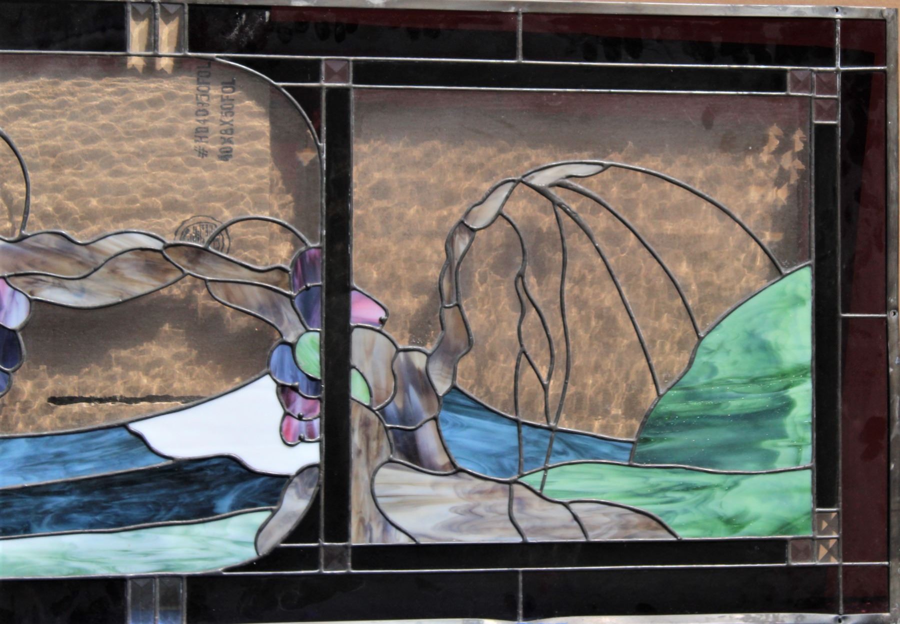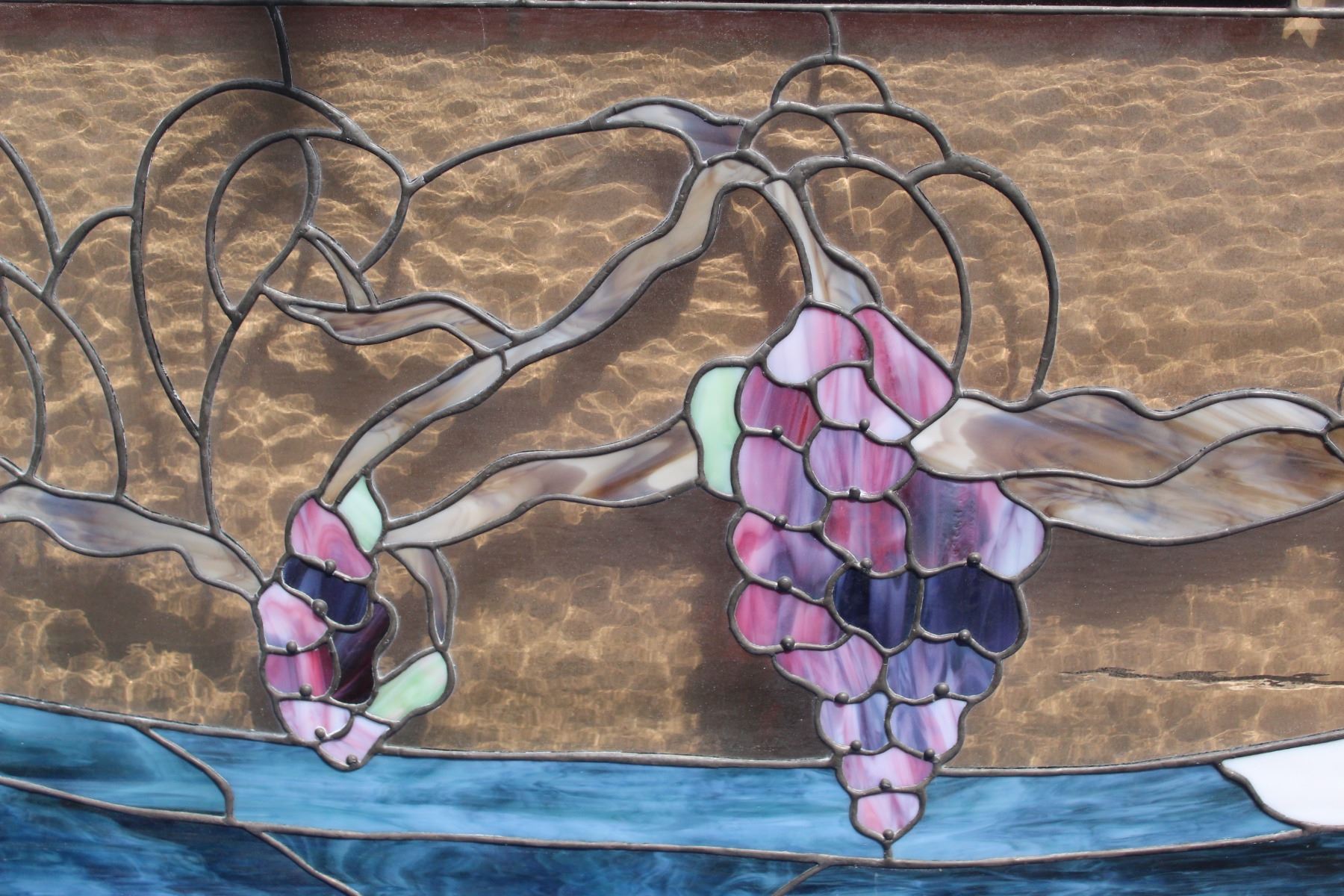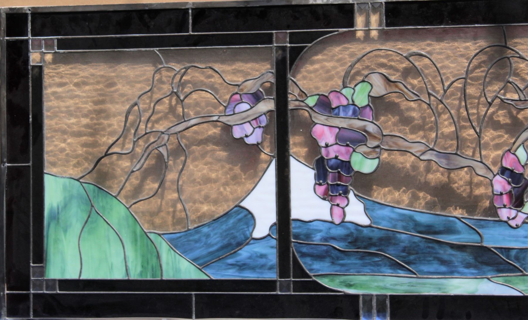Beautiful stained glass image of grapes on the vine with a mountain landscape behind. Border is a lovely wine color.