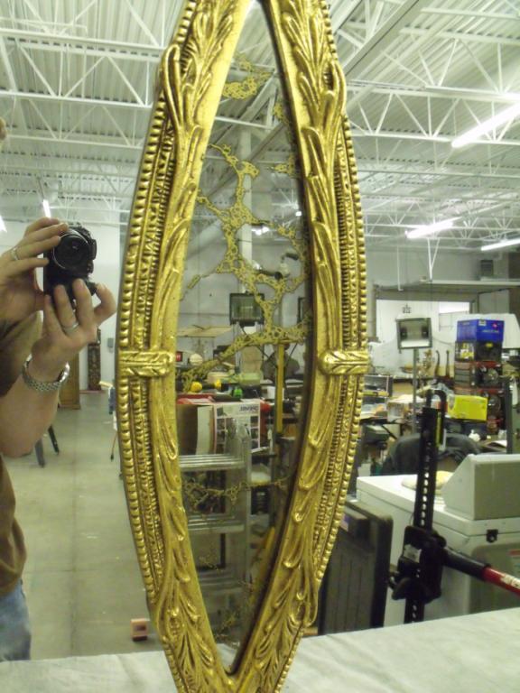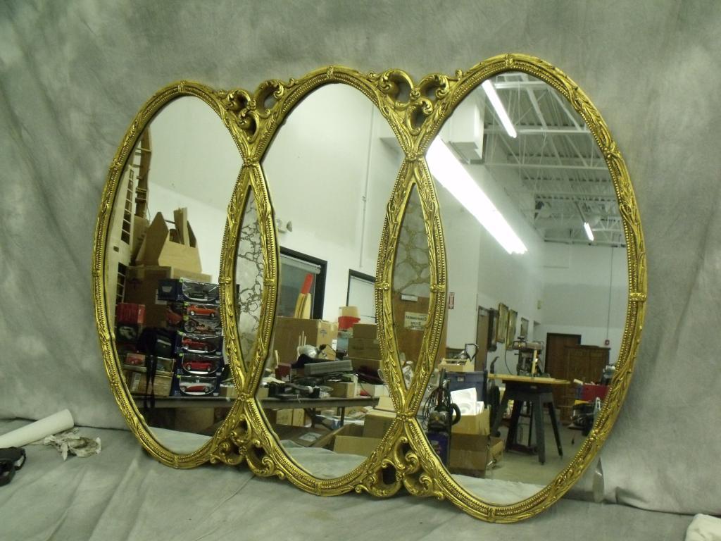 Majestic triplet oval shape mirror. With gold colored framing that has ornate scroll work, very unique! 63" long 45" tall in near new condition.