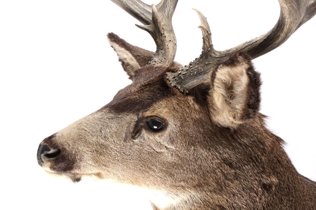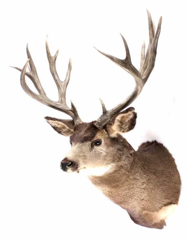 This is a shoulder mount Mule Deer taken by a muzzle loader in the Jemez Mountains West of Santa Fe, New Mexico. This shows a very large and impressive trophy set of antlers and excellent condition mount. Spread measures 31.5" wide. Shipping Crate will be 35"x35"x46" total shipping weight 126lbs Packaging $101. (24)