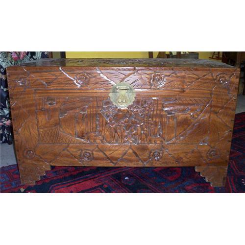<table width="100%" border="0" cellspacing="0" cellpadding="4"><tr><td><em> </em></td></tr><tr> <td width="100%"> This large, decorative trunk, which may date to the 1960s, features primitively carved designs on all its surfaces, giving it an exotic look. The trunk also closes with a metal latch, and opens to reveal a large storage space. There is also a shallow tray that rests in the inside lip of the trunk, in which smaller items may be stored. This trunk is in excellent condition, and would be perfect for storing extra clothing, additional blankets and quilts for the cold winter months, or for any number of other items. Shipping costs will be calculated at the time of purchase (as costs will vary depending on the location of the buyer) at the best possible rate. </td></tr><tr> <td> </td></tr><tr> <td>Reference #: RAFB44933</td></tr><tr><td>Condition:excellent</td></tr><tr><td>Year:1960s</td></tr><tr><td>Height:23</td></tr><tr><td>Depth:20</td></tr><tr><td>Width:39.5</td></tr><tr><td>Title:Large Trunk with Carved Designs</td></tr><tr><td>Materials:wood, metal</td></tr><tr><td>Location:Marion, SC</td></tr></table>