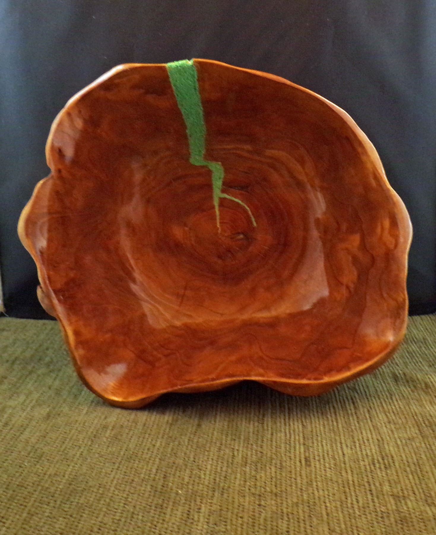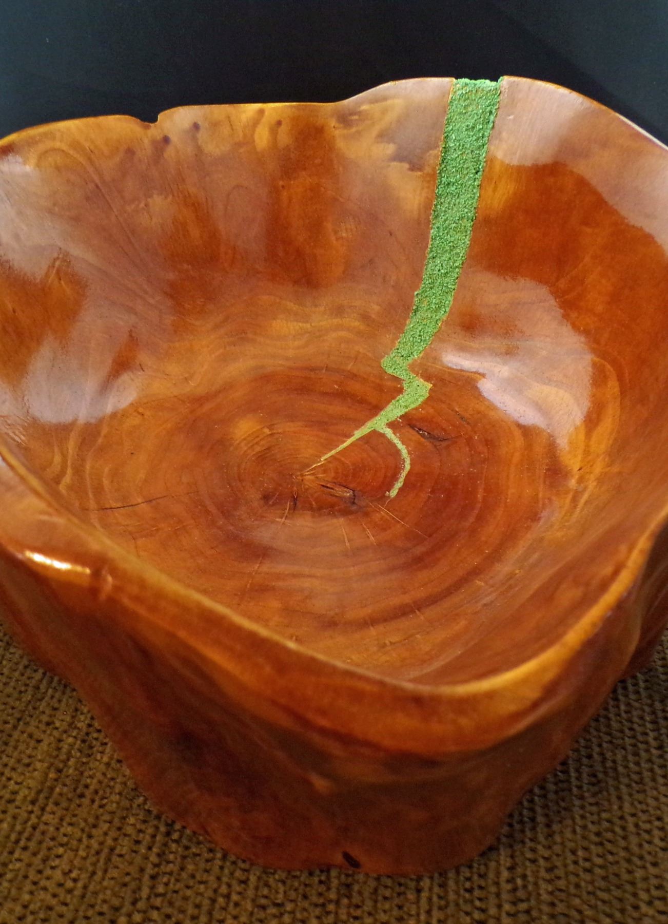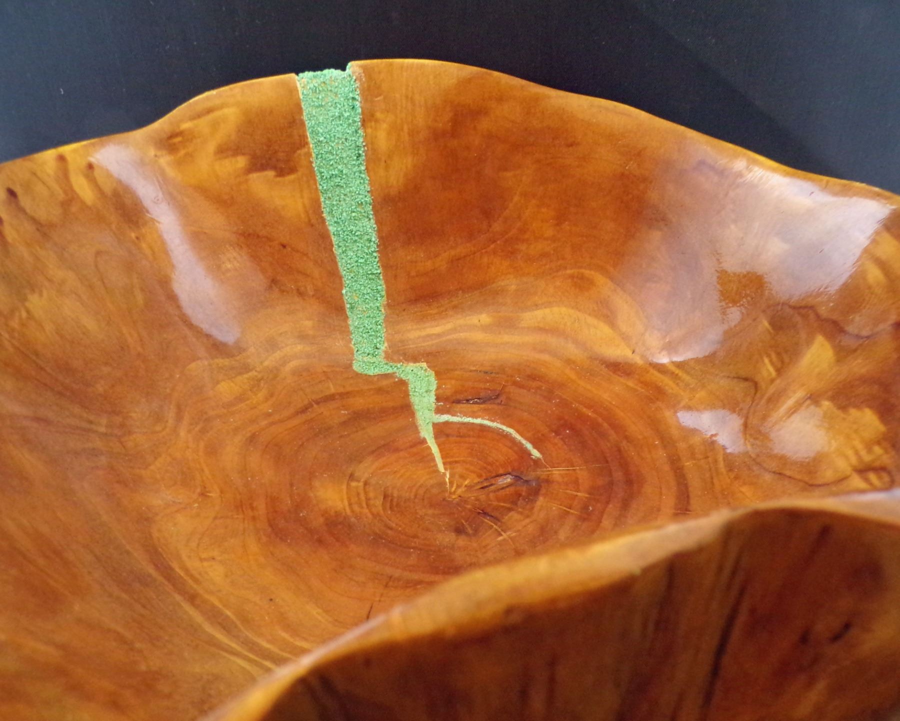 Large Turned Wood Bowl with Chip Inlay Turquoise by Eric Lima, measures 11.25'' x 9.75'' x 4'', one small area is missing turquoise chips, stunning bowl