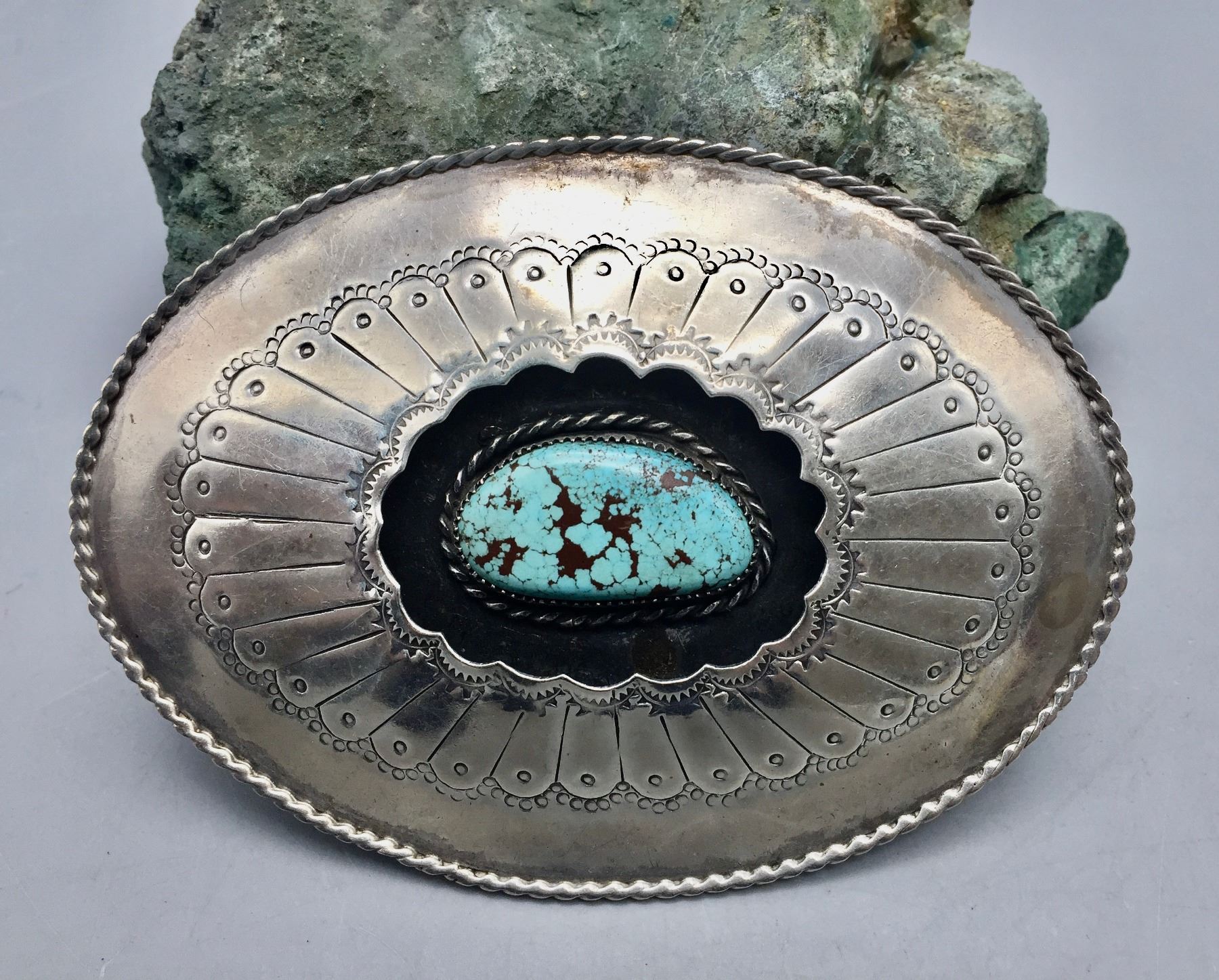 Description: For sale in this lot is a large hand stamped belt buckle with a shadowbox design featuring a turquoise cabochon with nice brown matrix. Maker: Marked RG, but exact maker unknown. Approx. Age: Vintage. Size: 3-1/2”w x 4-3/4” long, fits approx. 3-1/8” belt. Weighs 104.4 grams. Condition: Good for its age, normal wear expected. Please look closely at the pictures - they are an important part of our description. Shipping: There will be a $5 handling / packaging fee for shipping this lot. The actual cost of postage will be added on top of that.
