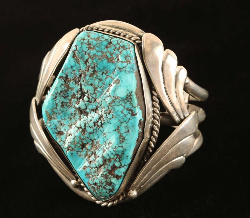 from the McGee's Trading Post. Arizona census marked 177103. Beautiful piece of natural turquoise set in heavy sterling silver. Measures 7 5/8" with a 1/2" gap. In excellent condition.