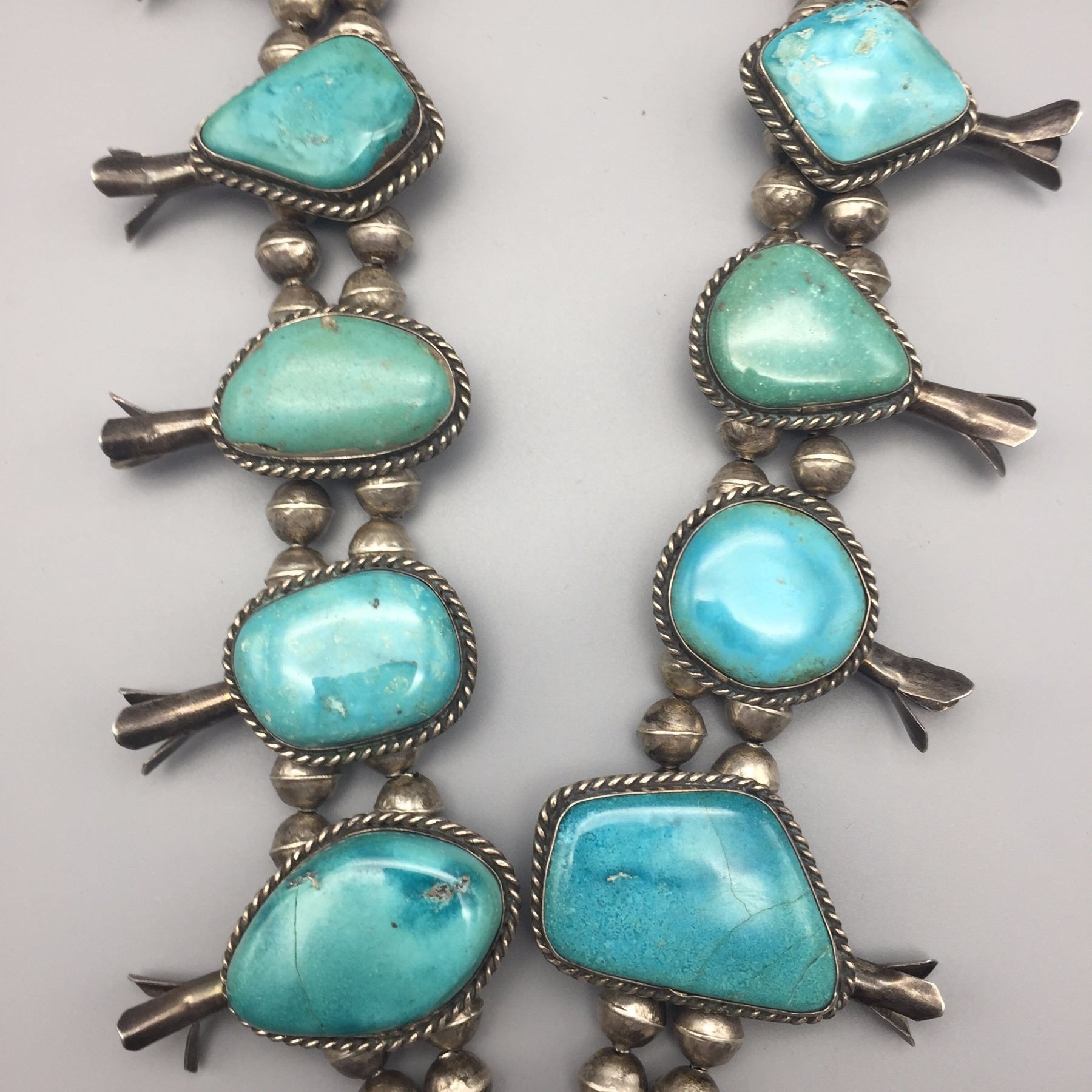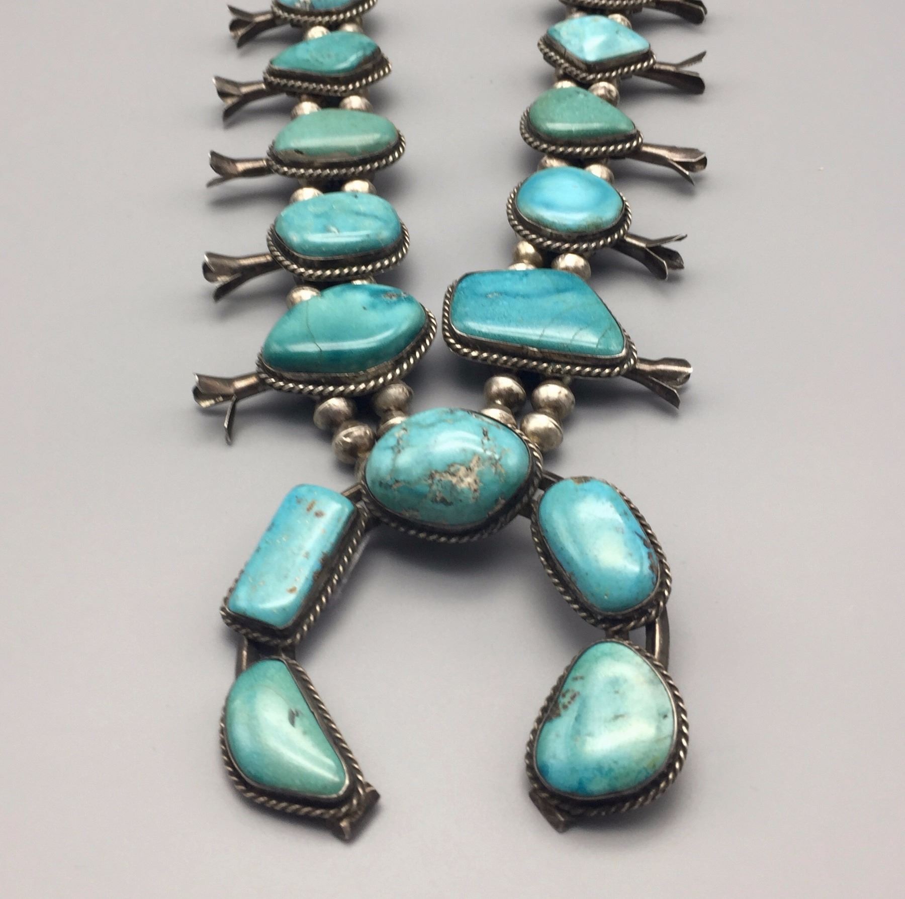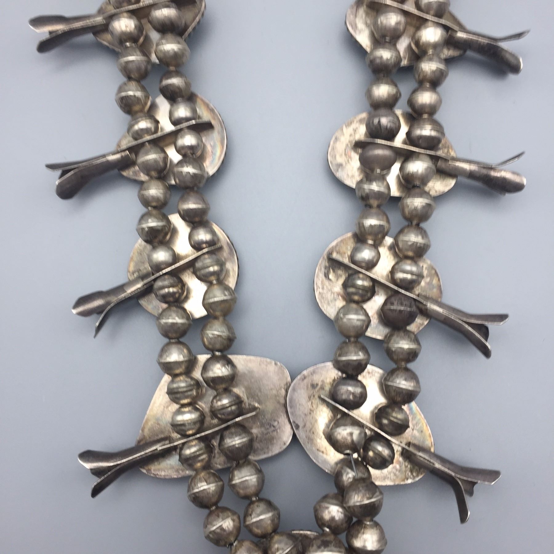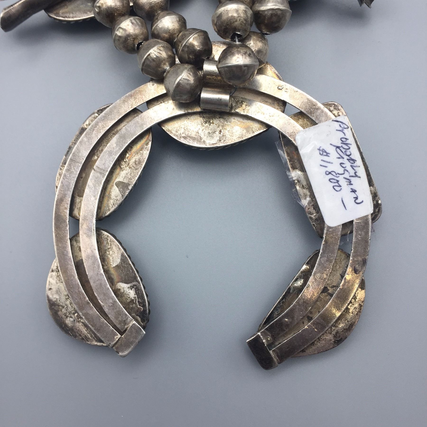 Maker: Unknown maker, no hallmarks, but appears to be vintage Navajo. Approx. Age: Vintage, circa 1960s - 70s. Size: Fits 29” around the neck, blossoms measure 2” x 2 1/2” and the naja is 3 1/2” w and dangles an additional 3 1/2”. Total weight is a whopping 341g. Additional Info: Large turquoise squash blossom necklace. Statement type of necklace! Appears to be natural turquoise and it has some nice pyrite in it. Handmade sterling beads, not machined or “bench” beads. Condition: Good, normal wear expected. Has a small hairline fracture in the turquoise on the lower left blossom as you are looking at it. Please look closely at the pictures - they are an important part of our description. Shipping: There will be a $5 handling / packaging fee for shipping this lot. The actual cost of postage will be added on top of that.