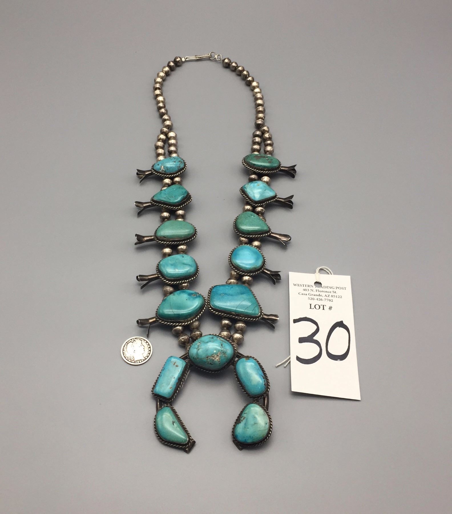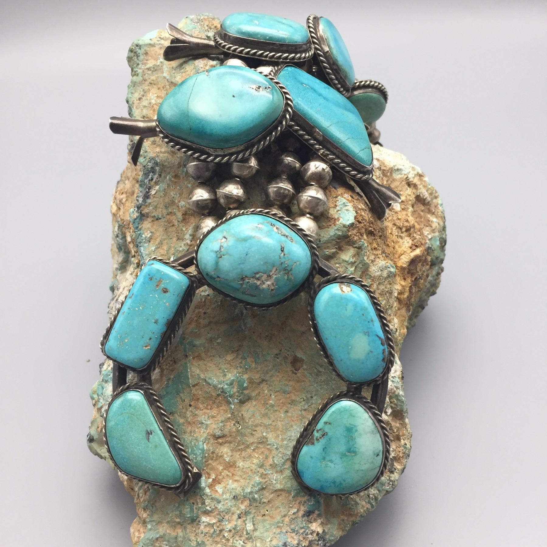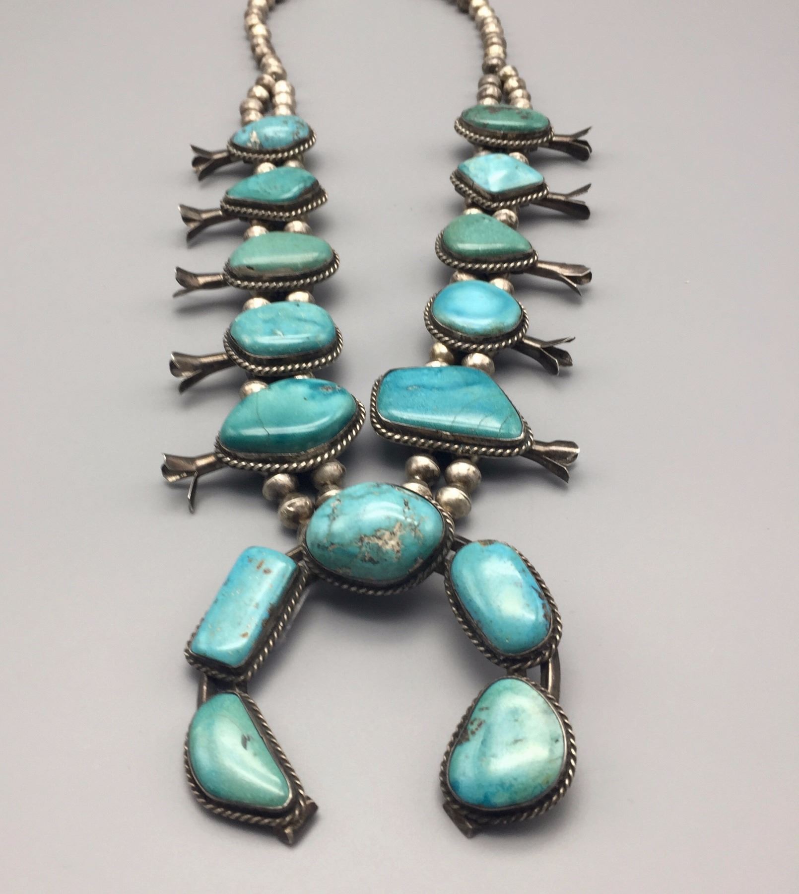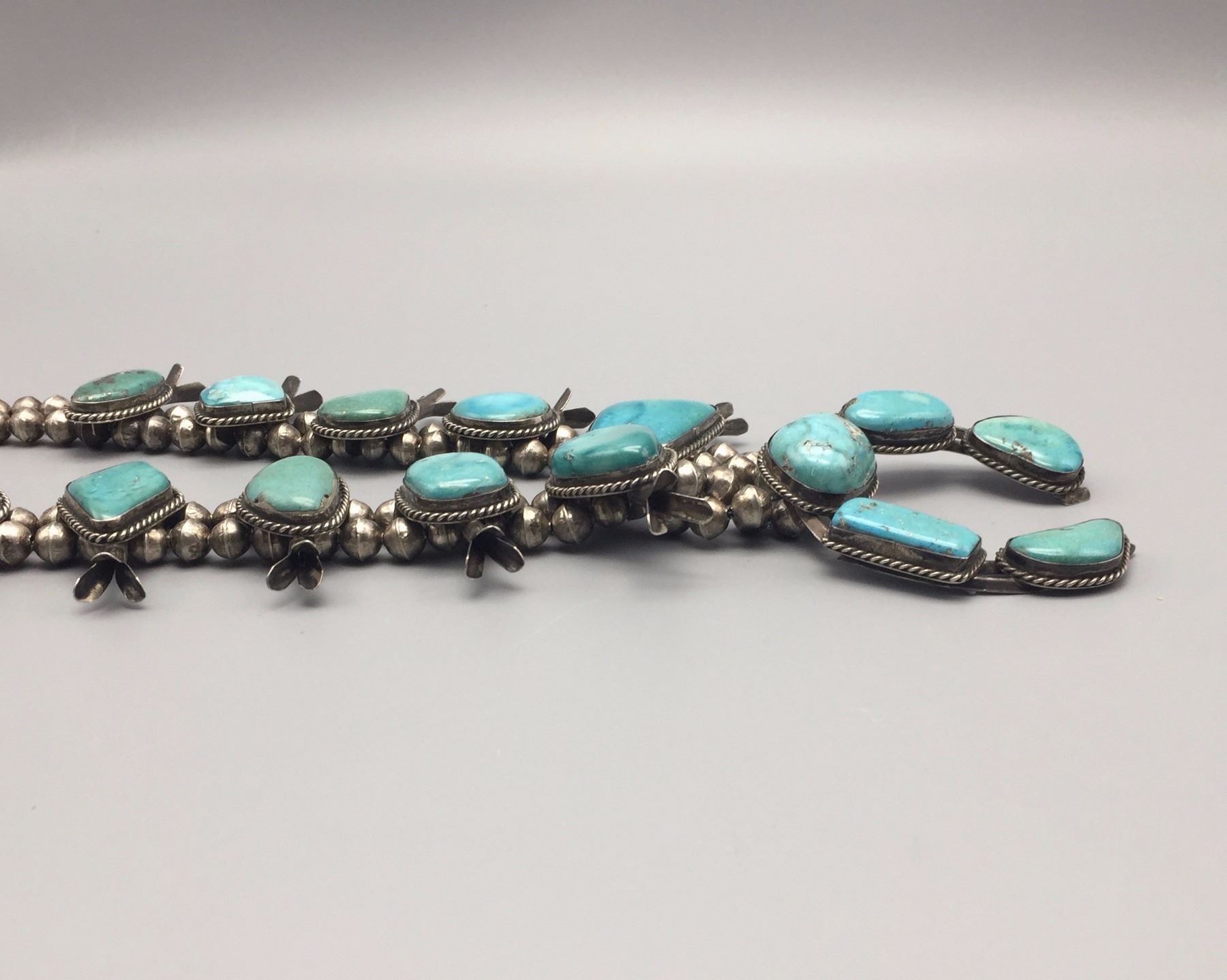 Maker: Unknown maker, no hallmarks, but appears to be vintage Navajo. Approx. Age: Vintage, circa 1960s - 70s. Size: Fits 29” around the neck, blossoms measure 2” x 2 1/2” and the naja is 3 1/2” w and dangles an additional 3 1/2”. Total weight is a whopping 341g. Additional Info: Large turquoise squash blossom necklace. Statement type of necklace! Appears to be natural turquoise and it has some nice pyrite in it. Handmade sterling beads, not machined or “bench” beads. Condition: Good, normal wear expected. Has a small hairline fracture in the turquoise on the lower left blossom as you are looking at it. Please look closely at the pictures - they are an important part of our description. Shipping: There will be a $5 handling / packaging fee for shipping this lot. The actual cost of postage will be added on top of that.