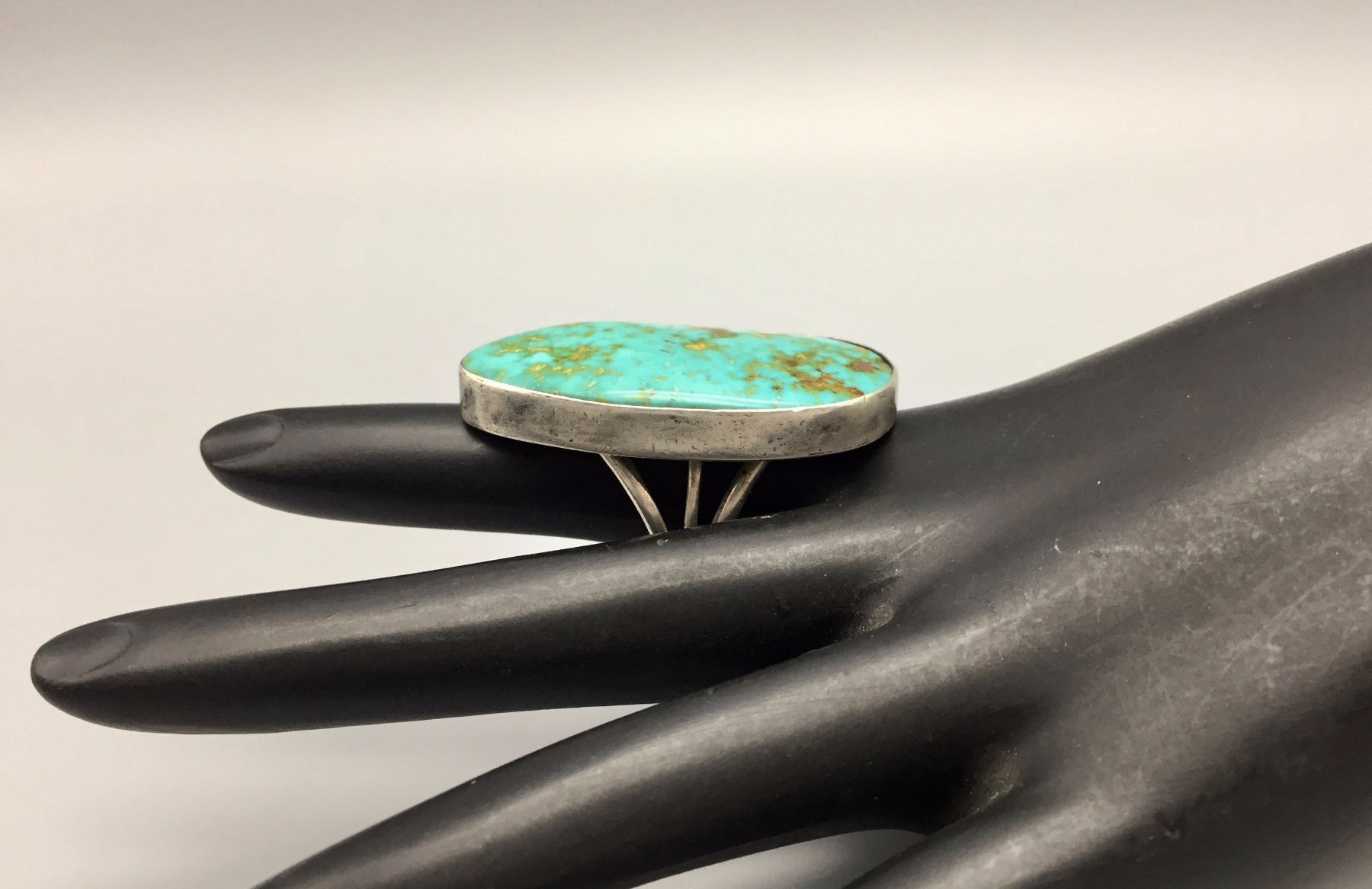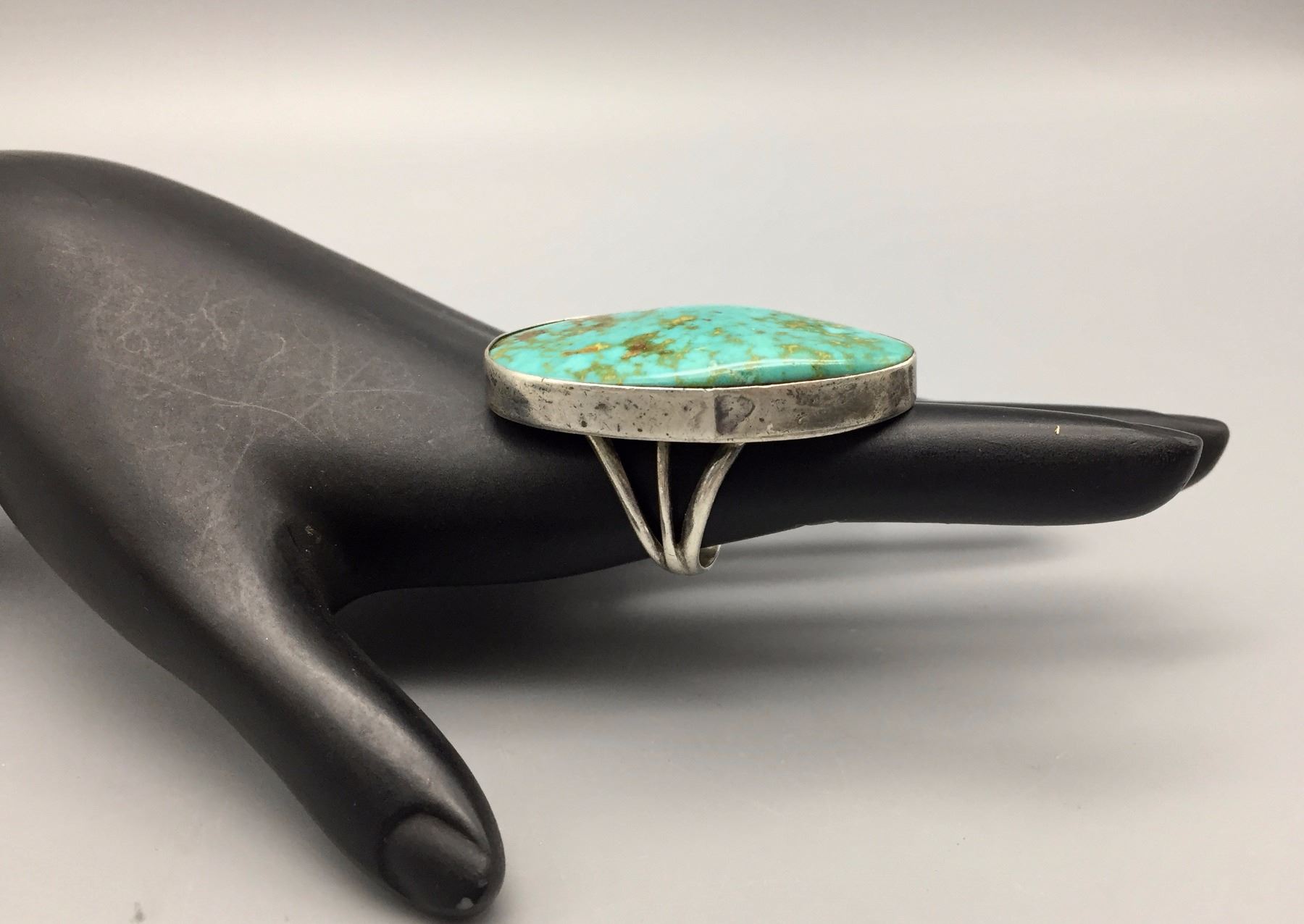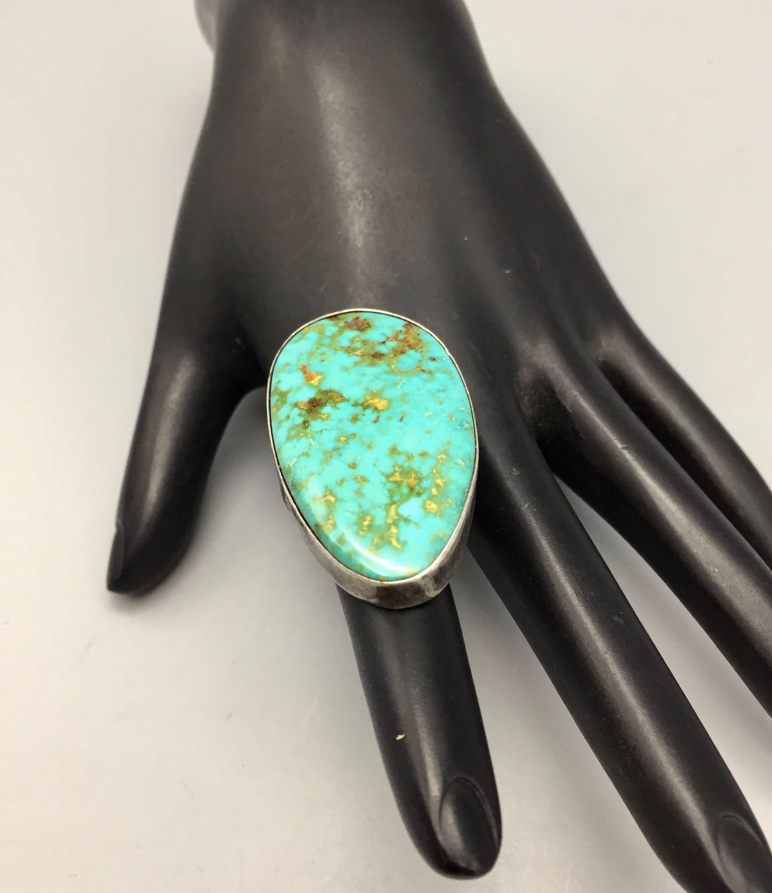 Description: A large turquoise stone set in a sterling silver ring. Stamped as sterling.                                                                                             Maker: Unknown.                                                                                                     Approx. Age: Vintage.                                                                                                   Size:  Sz 8.5. Weighs 16.2 g.                                                                                                                                                                                                                     Condition: Good for its age, normal wear expected. Please look closely at the pictures - they are an important part of our description. Shipping: There will be a $5 handling / packaging fee for shipping this lot. The actual cost of postage will be added on top of that.