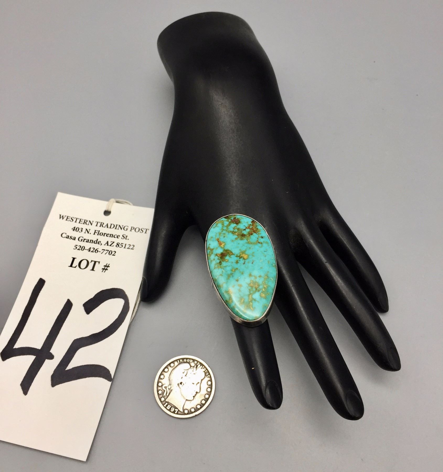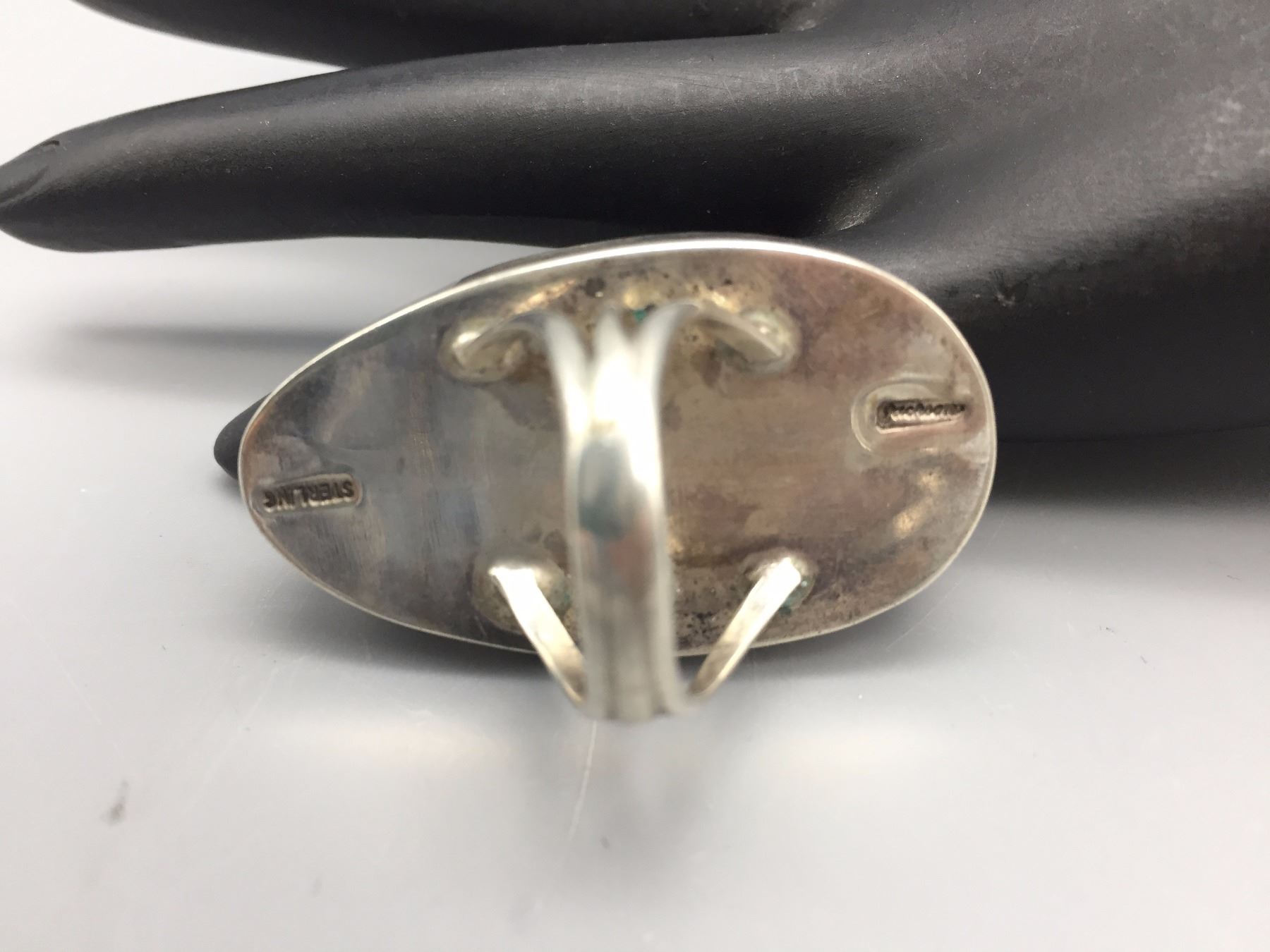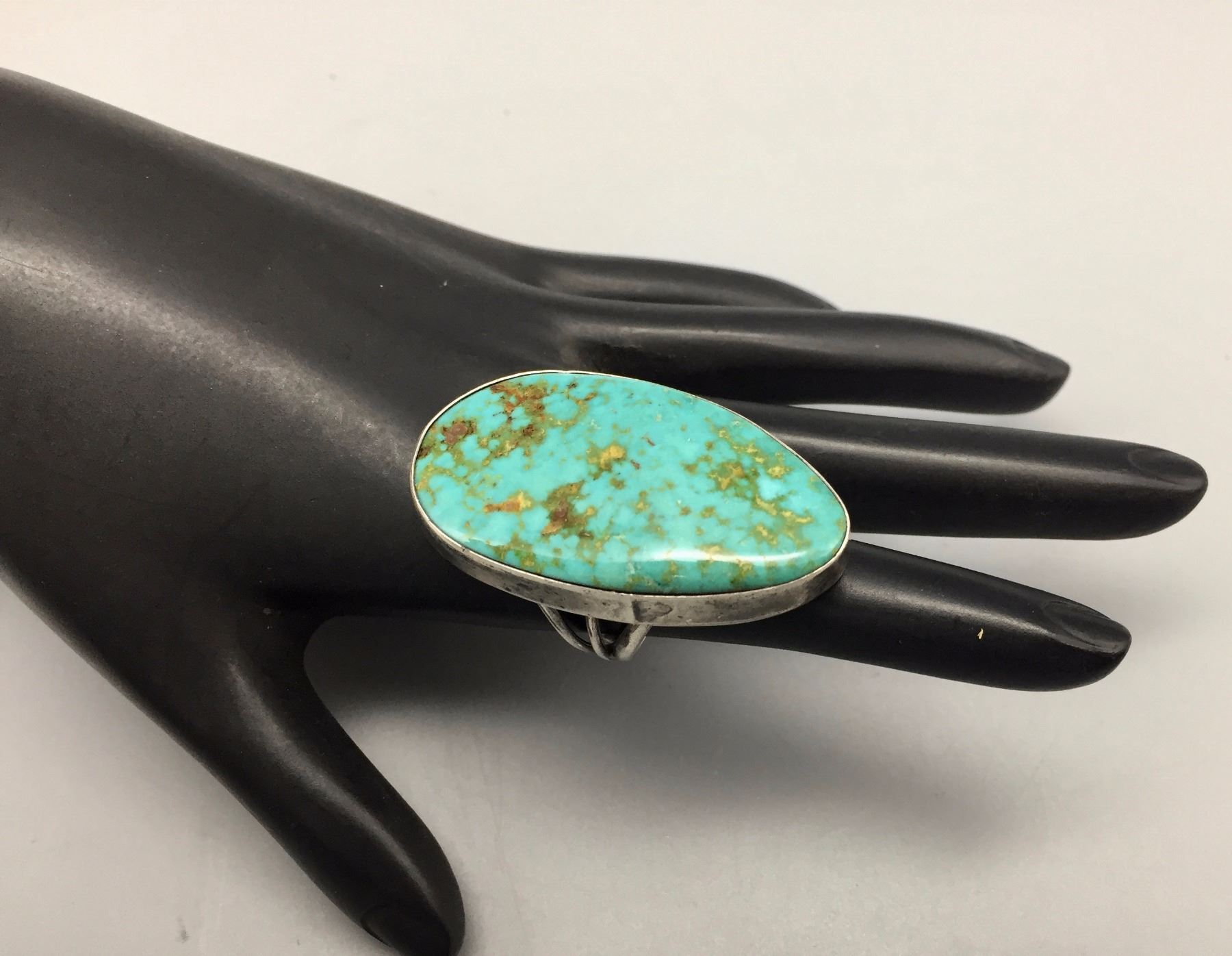 Description: A large turquoise stone set in a sterling silver ring. Stamped as sterling.                                                                                             Maker: Unknown.                                                                                                     Approx. Age: Vintage.                                                                                                   Size:  Sz 8.5. Weighs 16.2 g.                                                                                                                                                                                                                     Condition: Good for its age, normal wear expected. Please look closely at the pictures - they are an important part of our description. Shipping: There will be a $5 handling / packaging fee for shipping this lot. The actual cost of postage will be added on top of that.