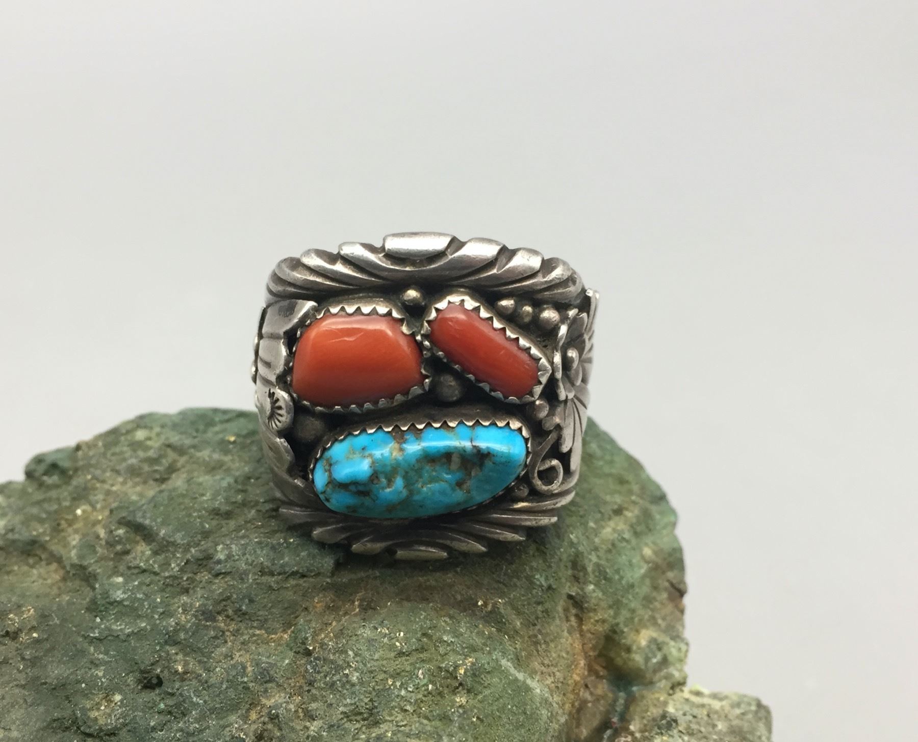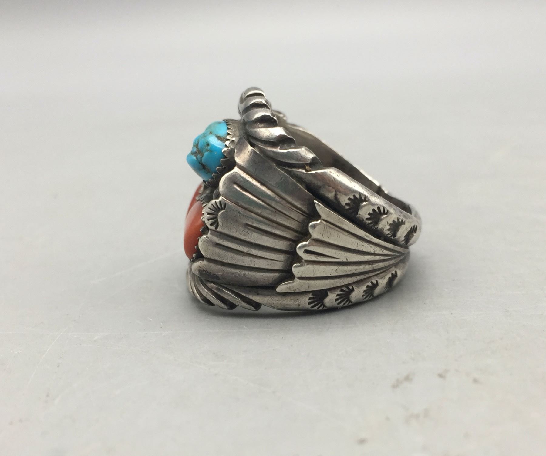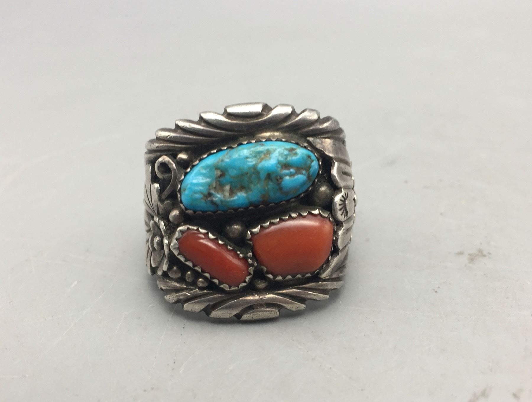Description: Presented for sale in this lot is a great turquoise and coral ring. This is a hard to find, larger size ring which features accents of silver appliqué. It is sterling silver. Maker: Hallmarked by Jerry Nelson, Navajo. Approx. Age: Modern. Size: Ring is a size 13. Weighs 25.3 grams. Condition: Good for its age, normal wear expected. Please look closely at the pictures - they are an important part of our description. Shipping: There will be a $5 handling, packaging fee for shipping this lot. The actual cost of postage will be added on top of that.