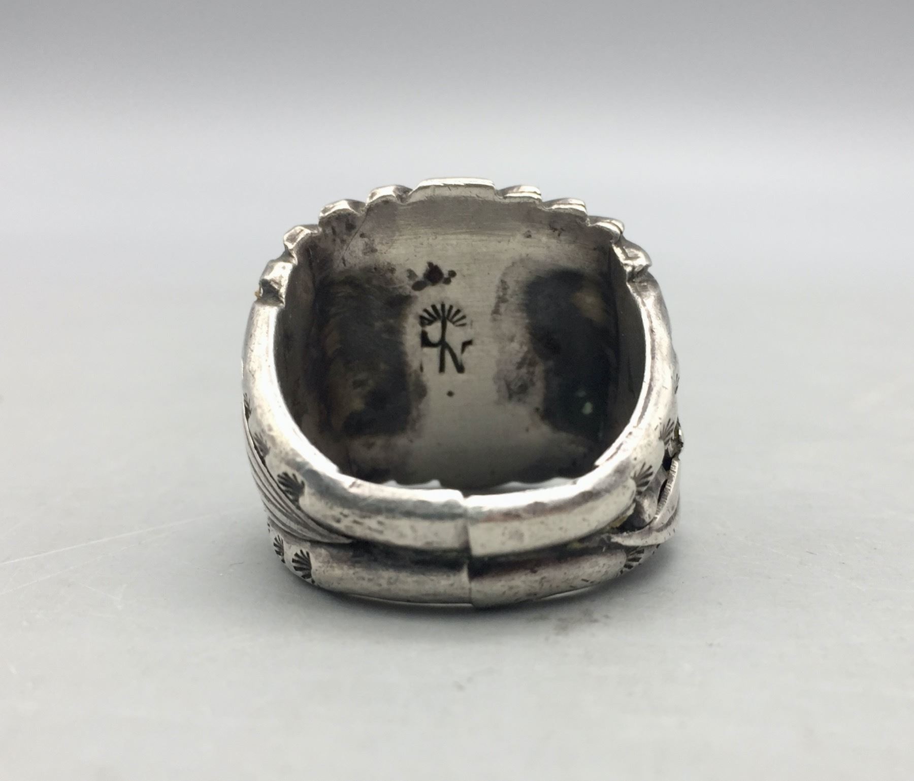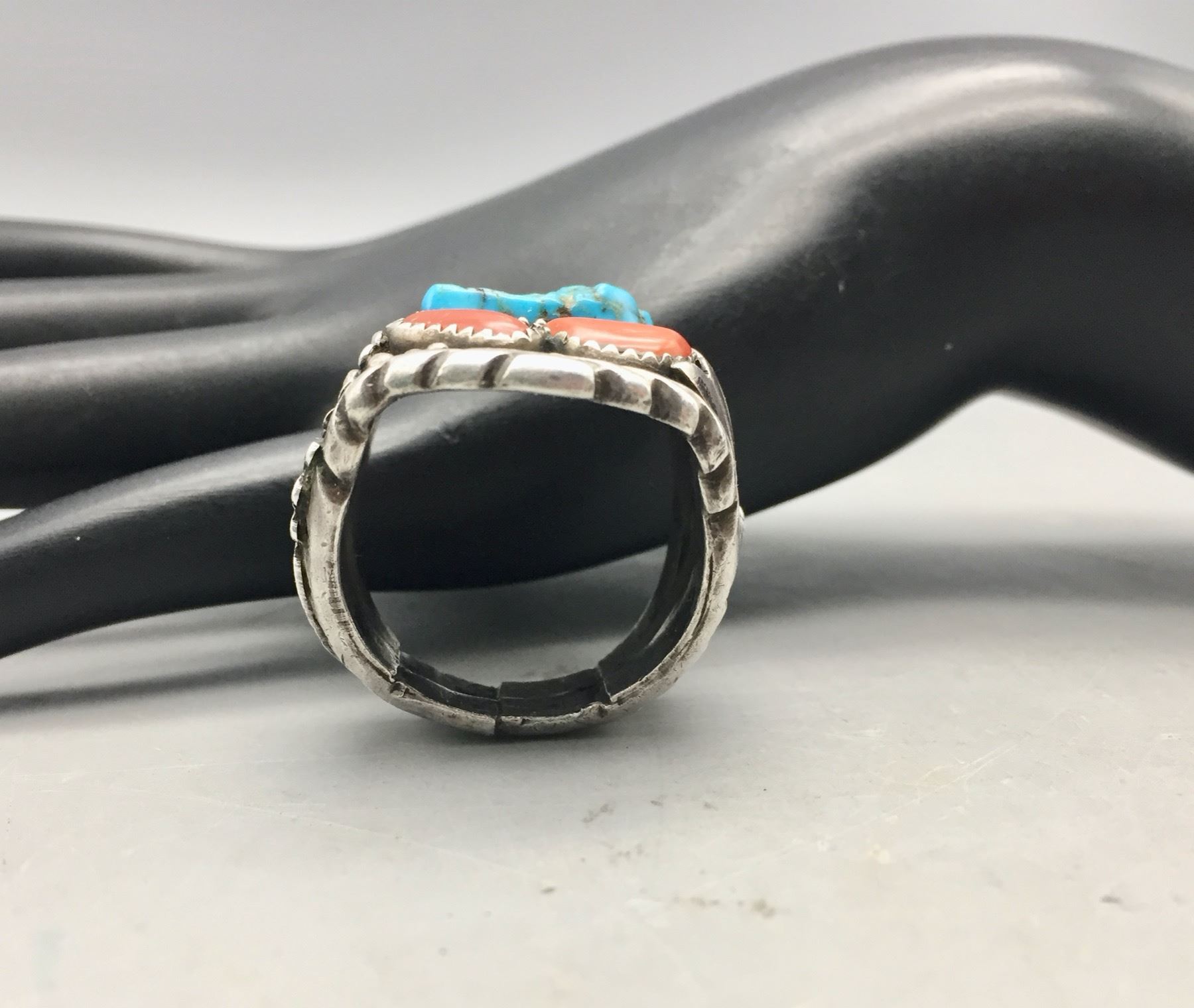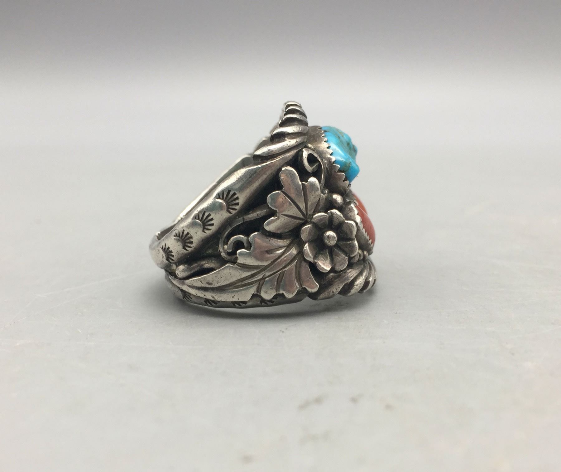 Description: Presented for sale in this lot is a great turquoise and coral ring. This is a hard to find, larger size ring which features accents of silver appliqué. It is sterling silver. Maker: Hallmarked by Jerry Nelson, Navajo. Approx. Age: Modern. Size: Ring is a size 13. Weighs 25.3 grams. Condition: Good for its age, normal wear expected. Please look closely at the pictures - they are an important part of our description. Shipping: There will be a $5 handling, packaging fee for shipping this lot. The actual cost of postage will be added on top of that.