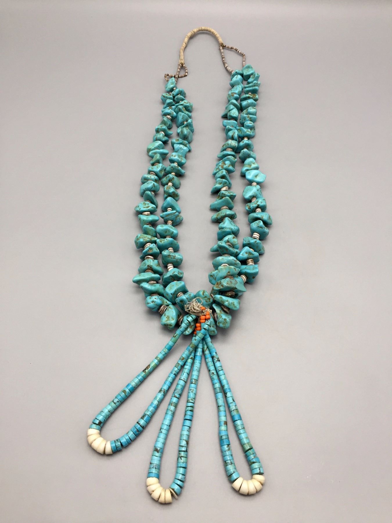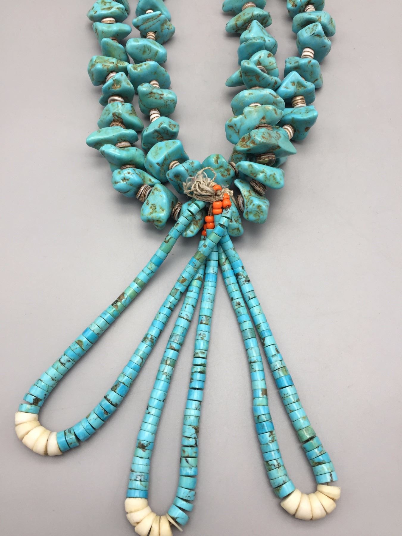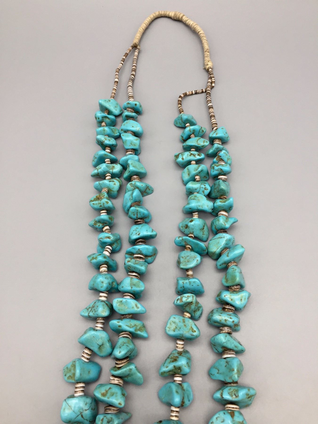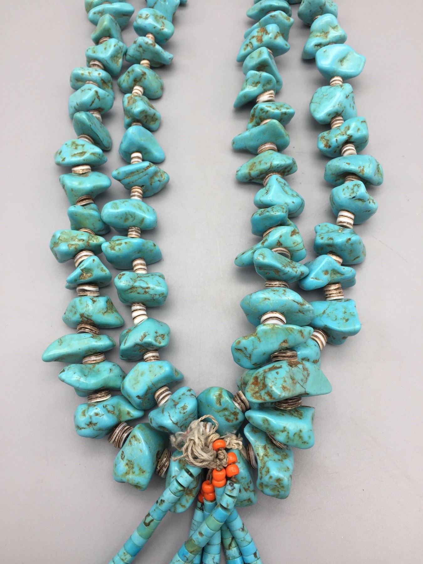 Description: A large and chunky, two strand turquoise and shell necklace with three jocals. A bigger, statement kind of necklace. Maker: Unknown, but Pueblo in style. Approx. Age: Vintage, circa 1960s - 70s. Size: The necklace fits approx. 36" inches around the neck and joclas measure 6” l .Weighs a whopping 520.0 g. Condition: Probably missing one of the original joclas (they usually come in pairs), otherwise, normal wear expected. Please look closely at the pictures - they are an important part of our description. Shipping: There will be a $5 handling / packaging fee for shipping this lot. The actual cost of postage will be added on top of that.