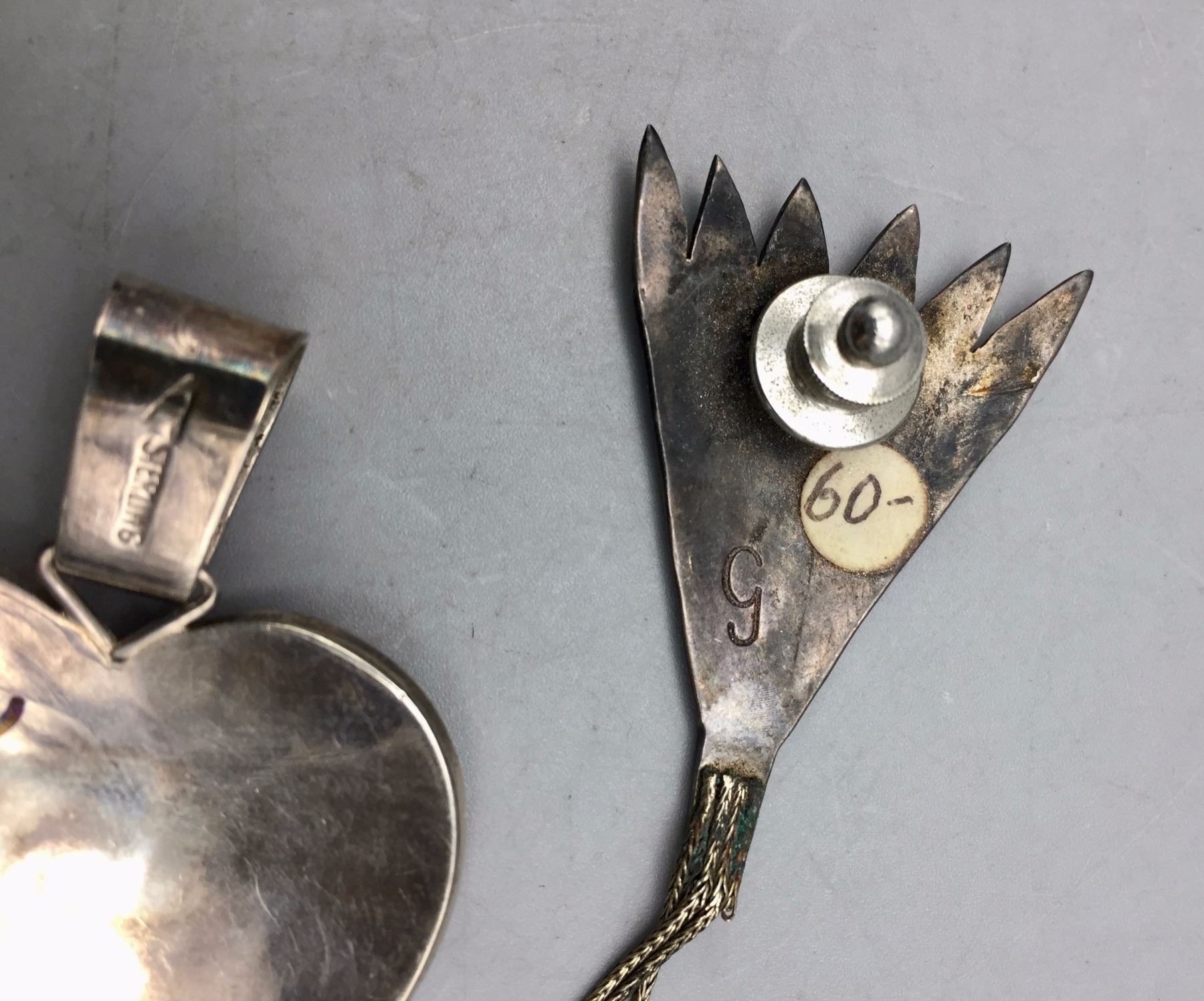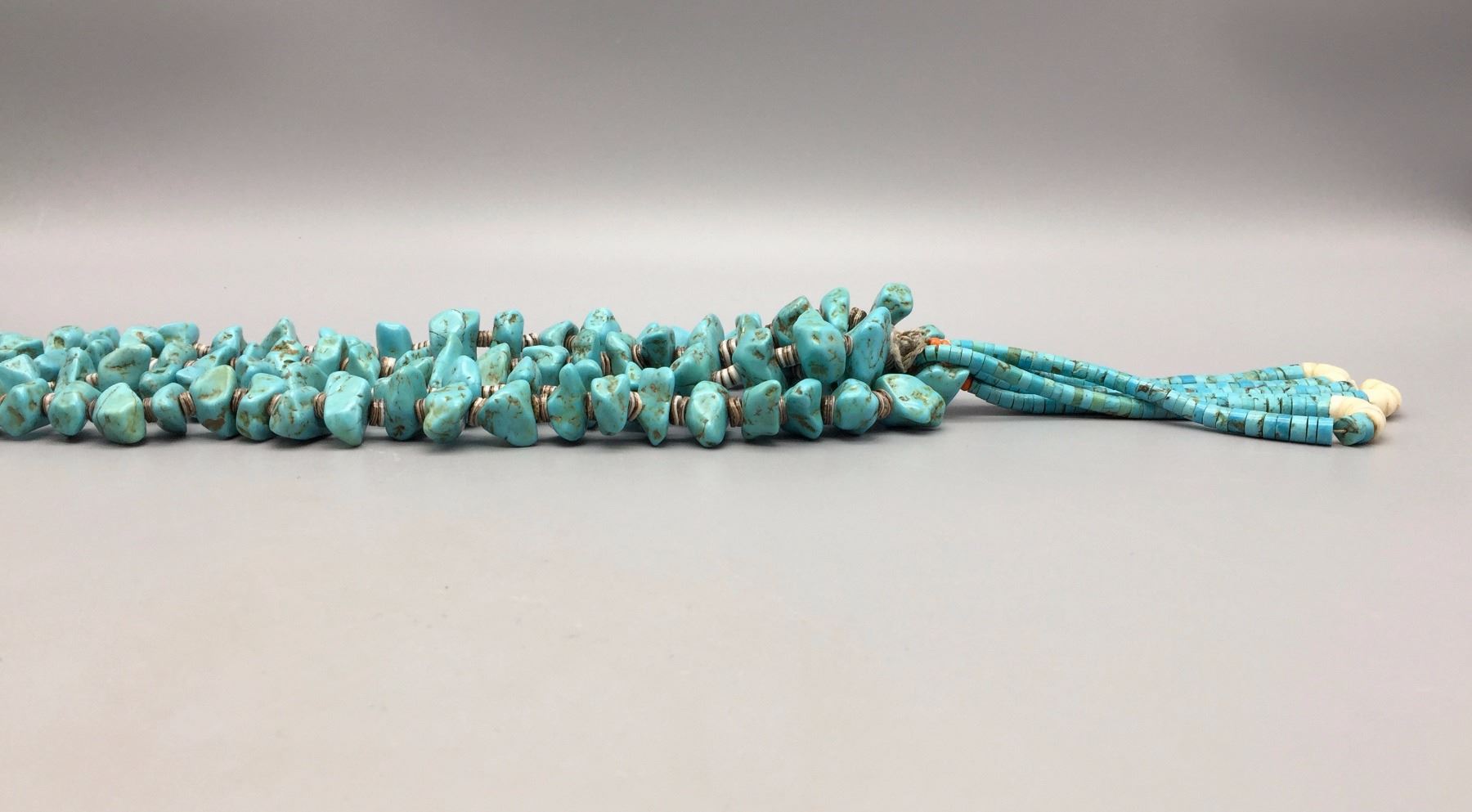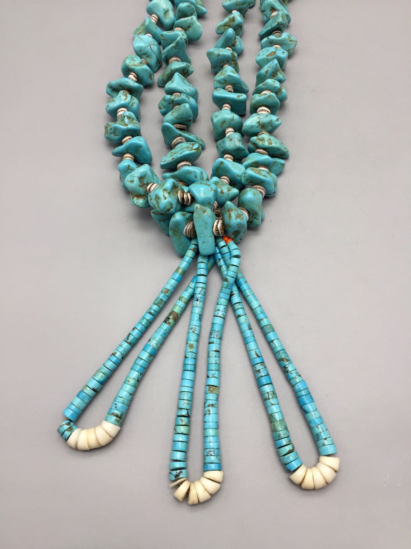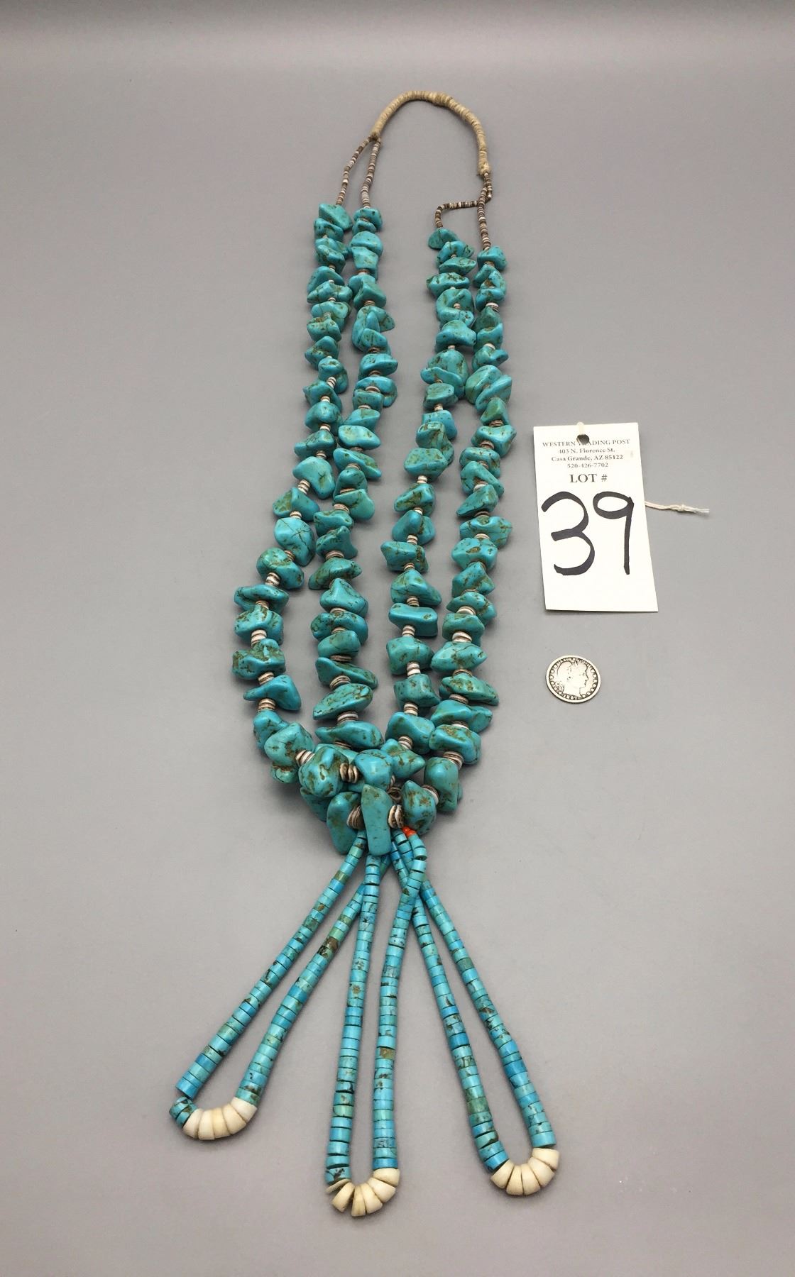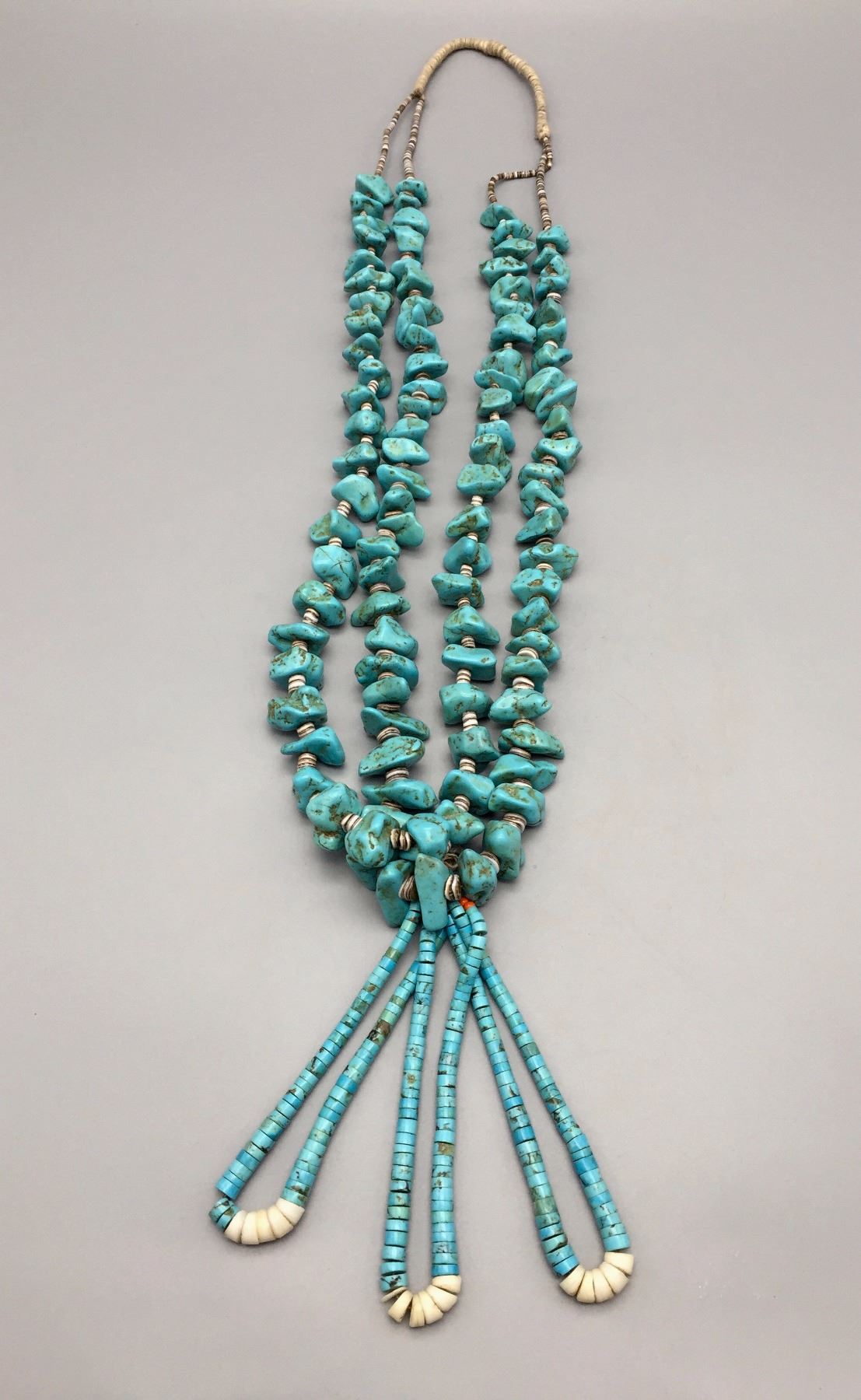 Description: A large and chunky, two strand turquoise and shell necklace with three jocals. A bigger, statement kind of necklace. Maker: Unknown, but Pueblo in style. Approx. Age: Vintage, circa 1960s - 70s. Size: The necklace fits approx. 36" inches around the neck and joclas measure 6” l .Weighs a whopping 520.0 g. Condition: Probably missing one of the original joclas (they usually come in pairs), otherwise, normal wear expected. Please look closely at the pictures - they are an important part of our description. Shipping: There will be a $5 handling / packaging fee for shipping this lot. The actual cost of postage will be added on top of that.