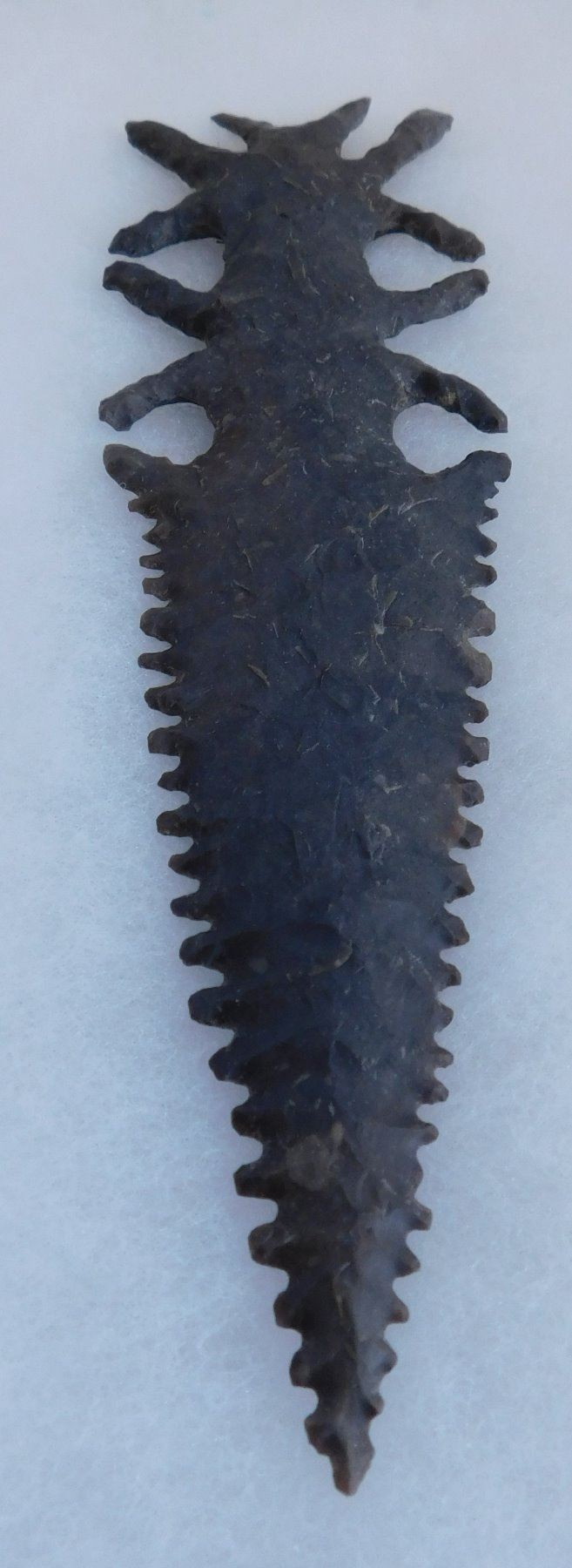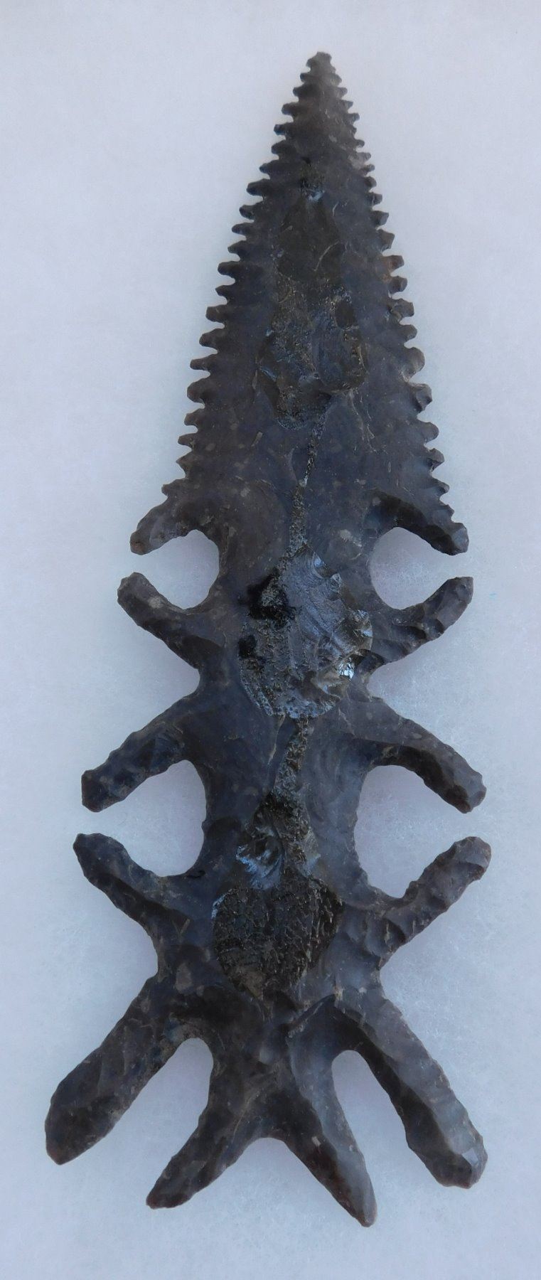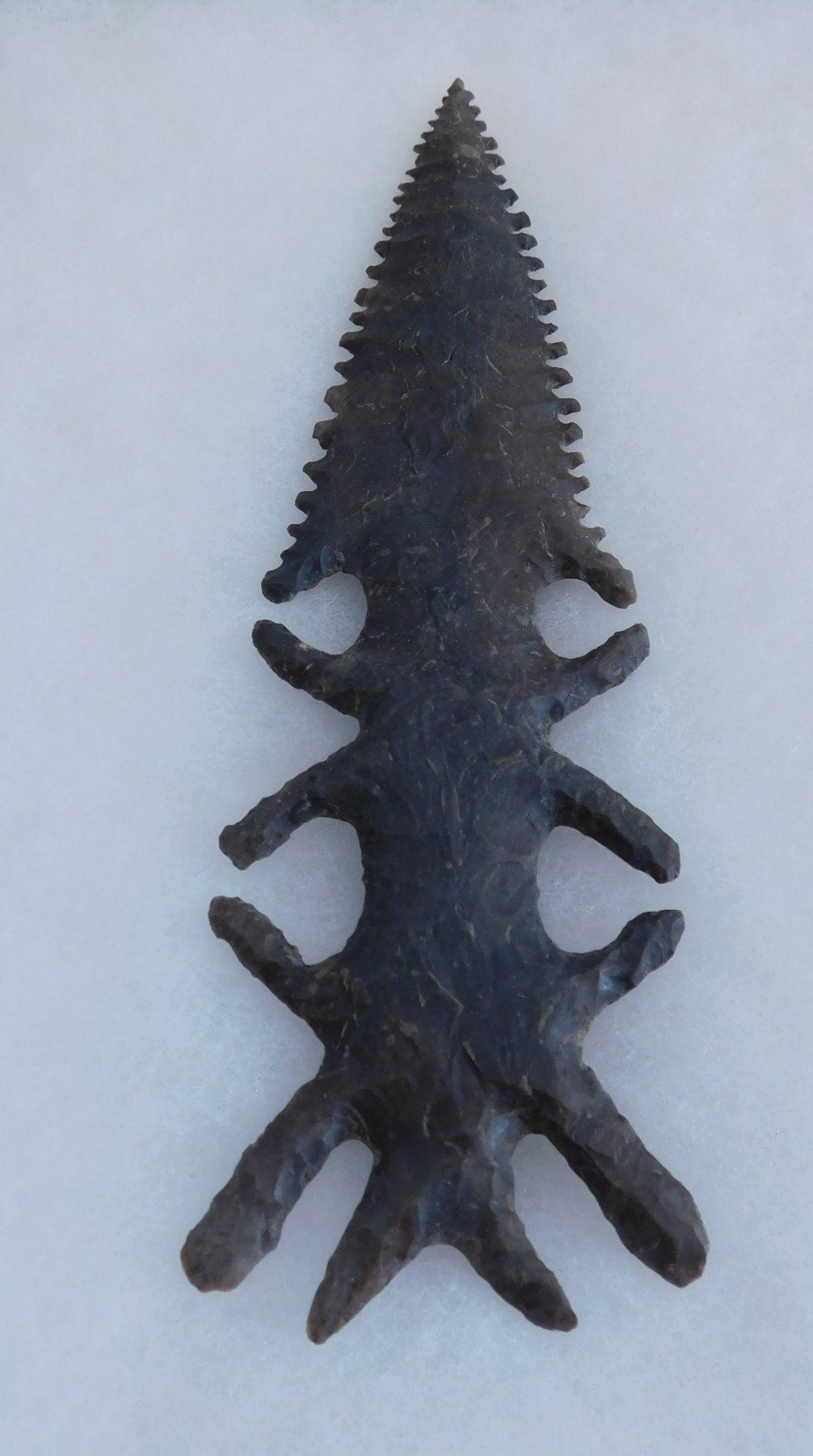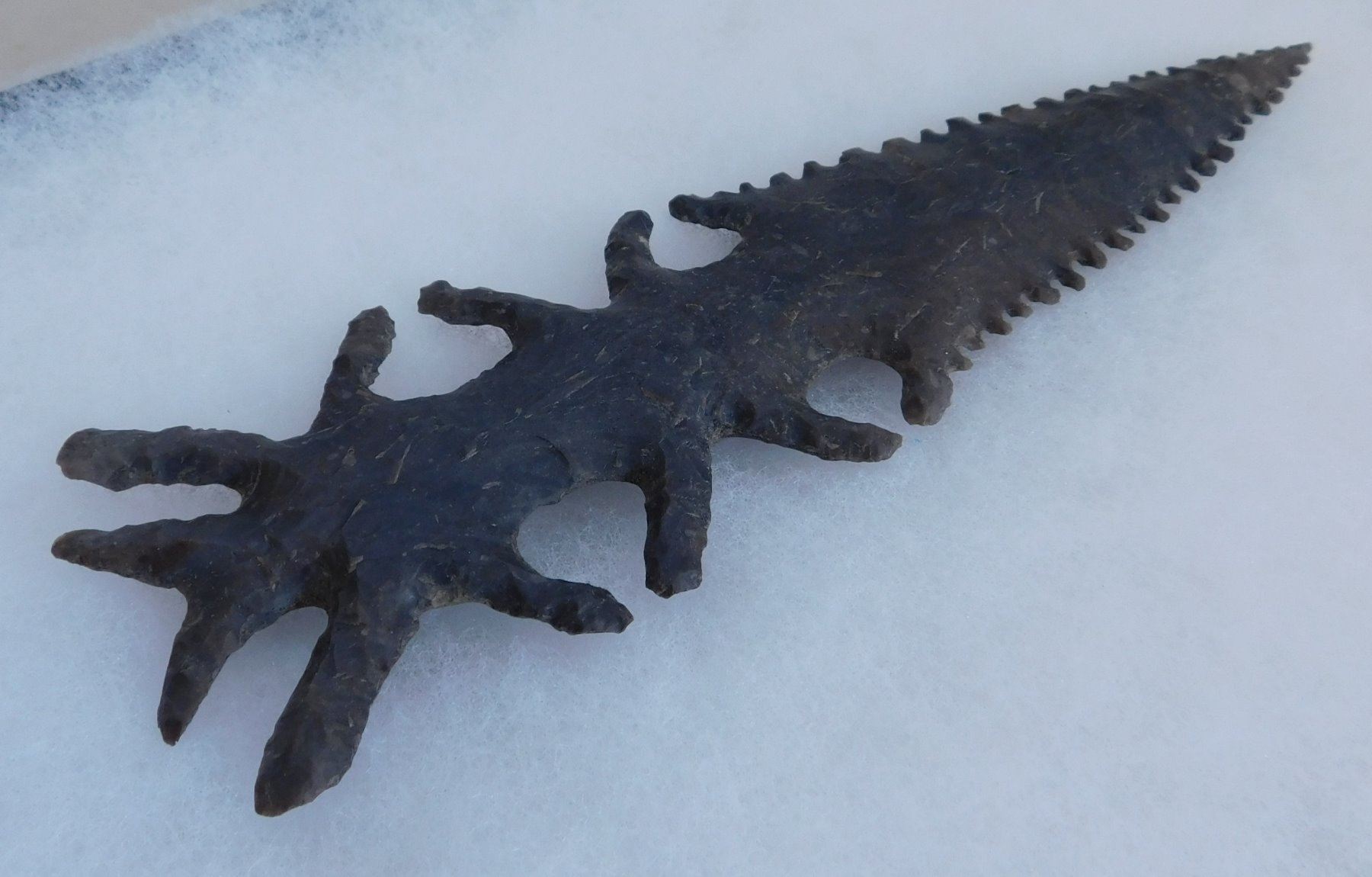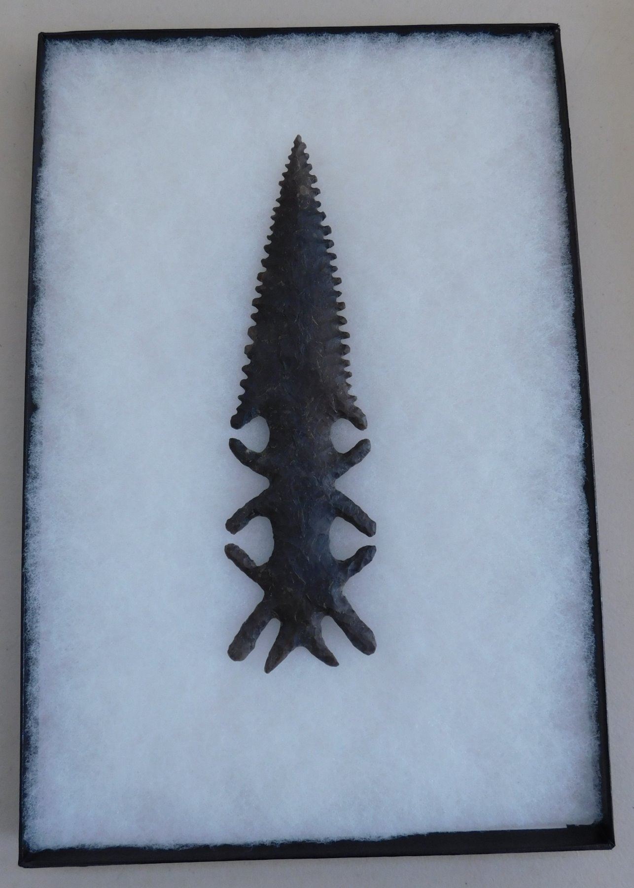 Large Tussinger Eccentric Blade, circa 1920s. Made of chert, the item measures 2 1/8" x 8". Oklahoma. Once on display at the Oral Roberts University Museum. One of the largest of the Mack Tussinger re-chipped, ancient. flint blades. There were thousands in his collection. Frame not included. Condition: Very fine, see images. Shipping: $45.00 w/insurance and signature.