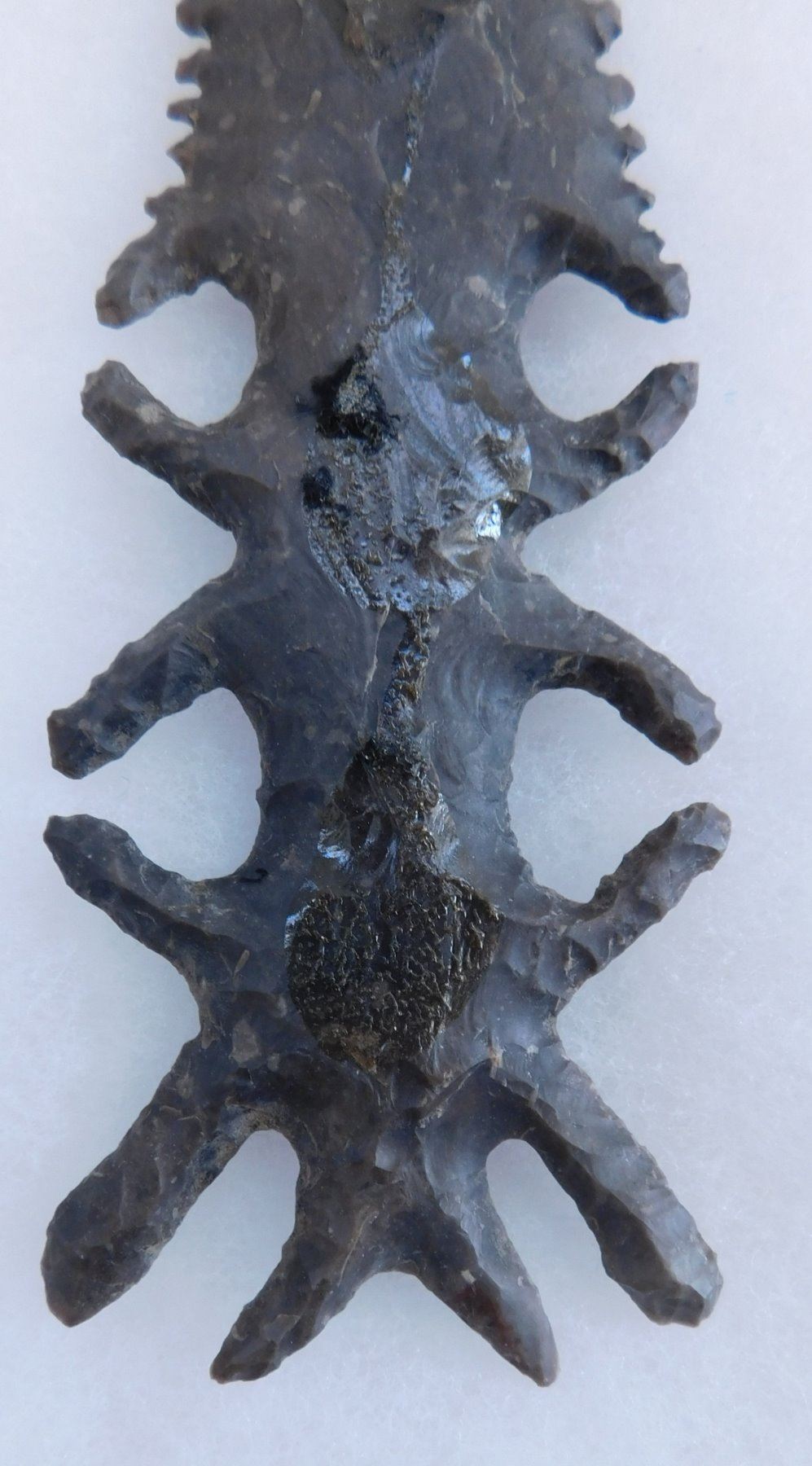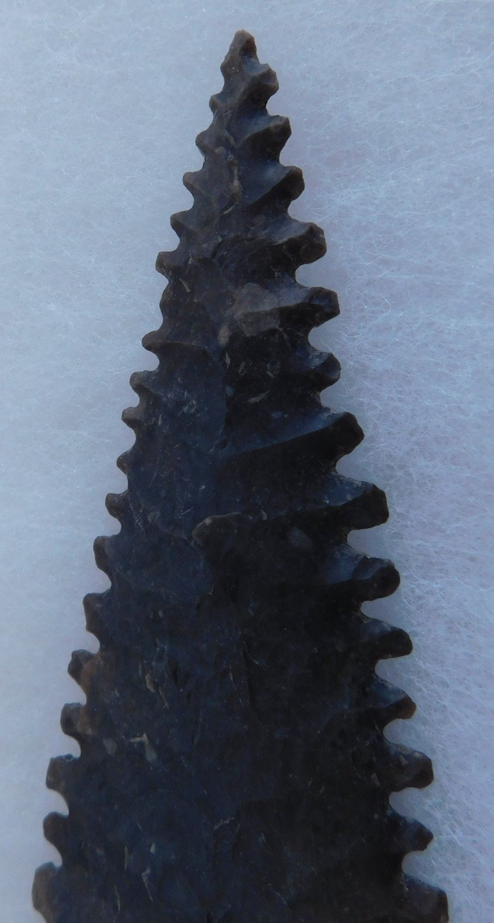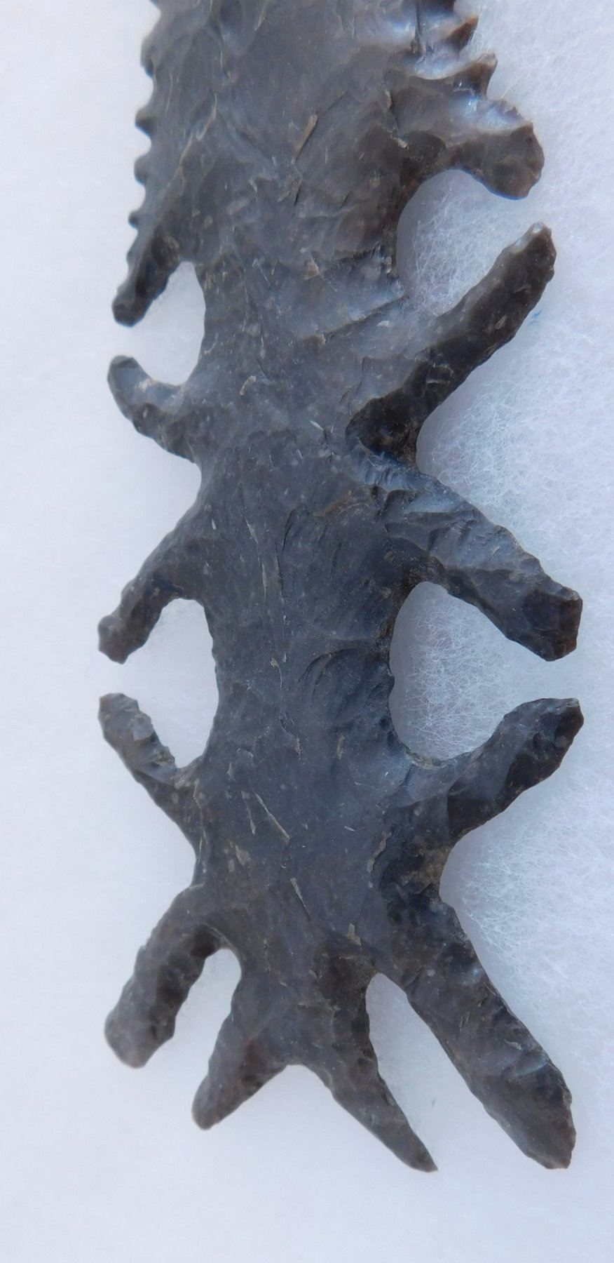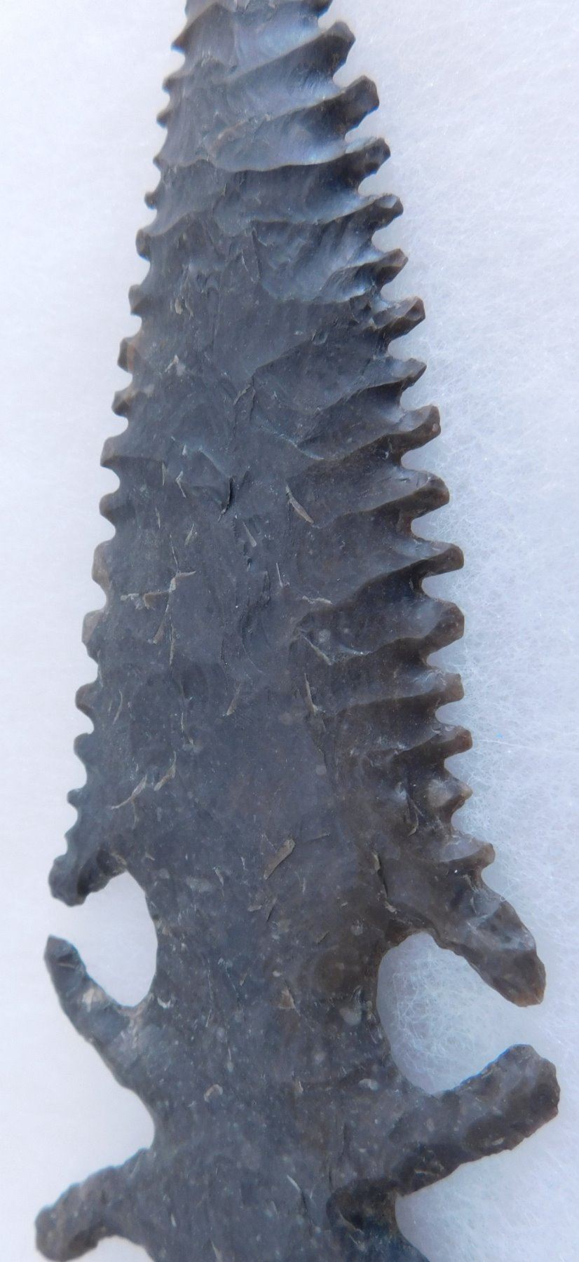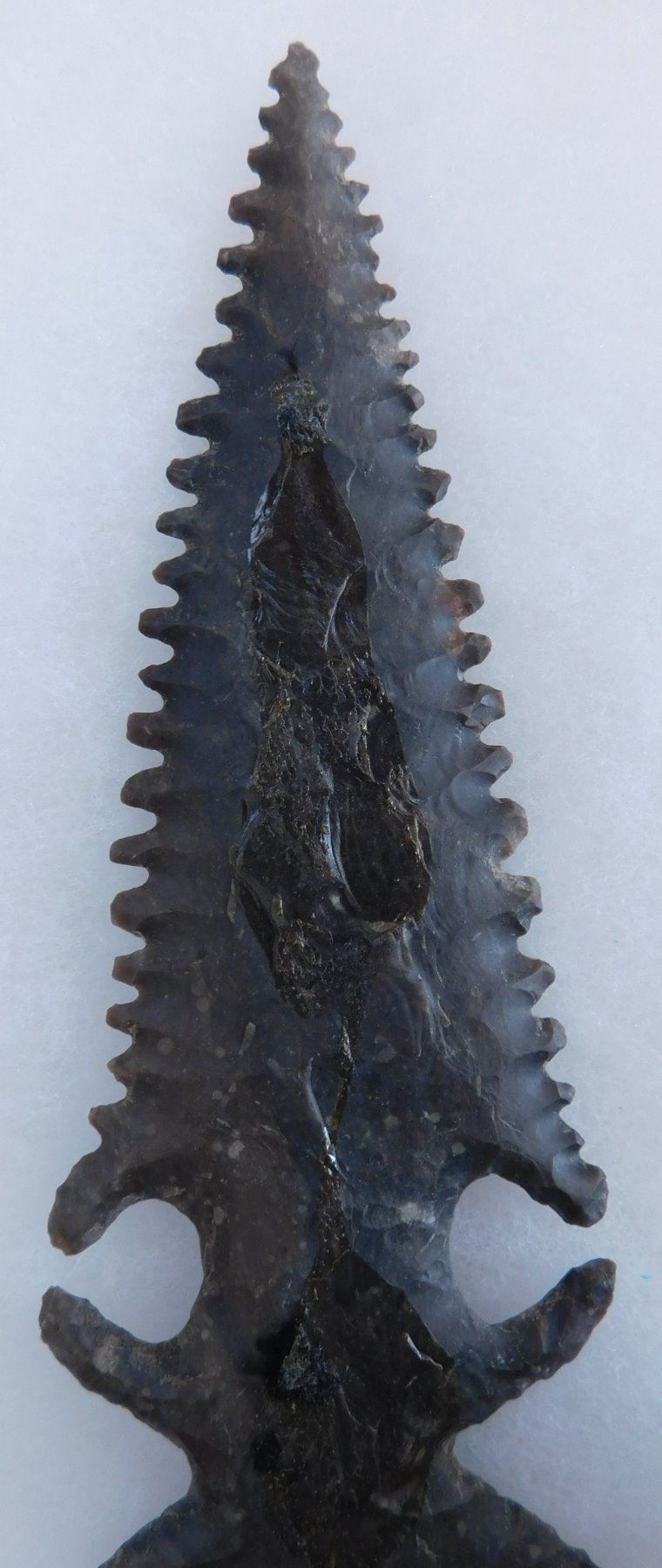 Large Tussinger Eccentric Blade, circa 1920s. Made of chert, the item measures 2 1/8" x 8". Oklahoma. Once on display at the Oral Roberts University Museum. One of the largest of the Mack Tussinger re-chipped, ancient. flint blades. There were thousands in his collection. Frame not included. Condition: Very fine, see images. Shipping: $45.00 w/insurance and signature.