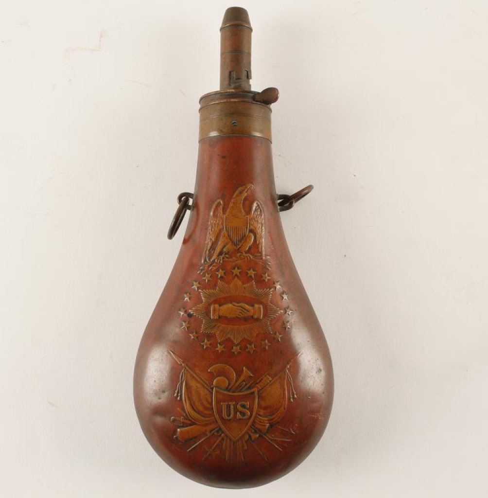Large US Batty marked brass Peace flask dated 1853; approx. 10” overall with spread eagle and shaking hands; graduated spout with an old ding to the tip of the spout; both hang rings remaining and the condition of the flask is overall good to very good showing a deep patina from age and tight seams. Est.: $200-$300.