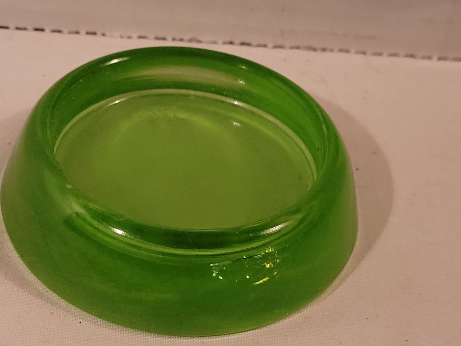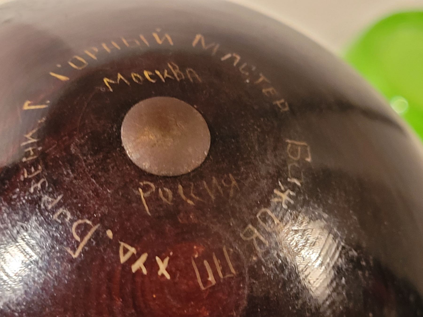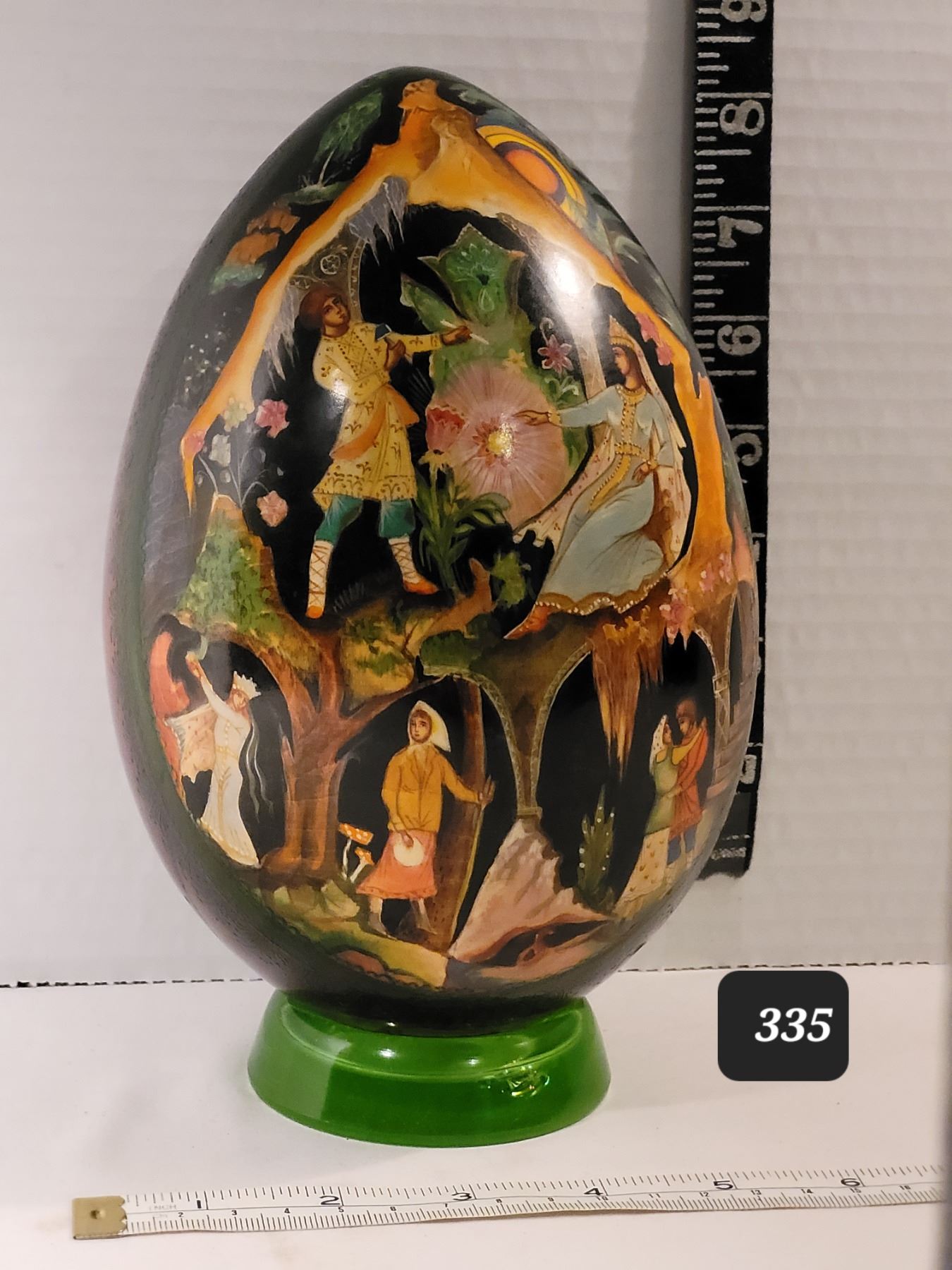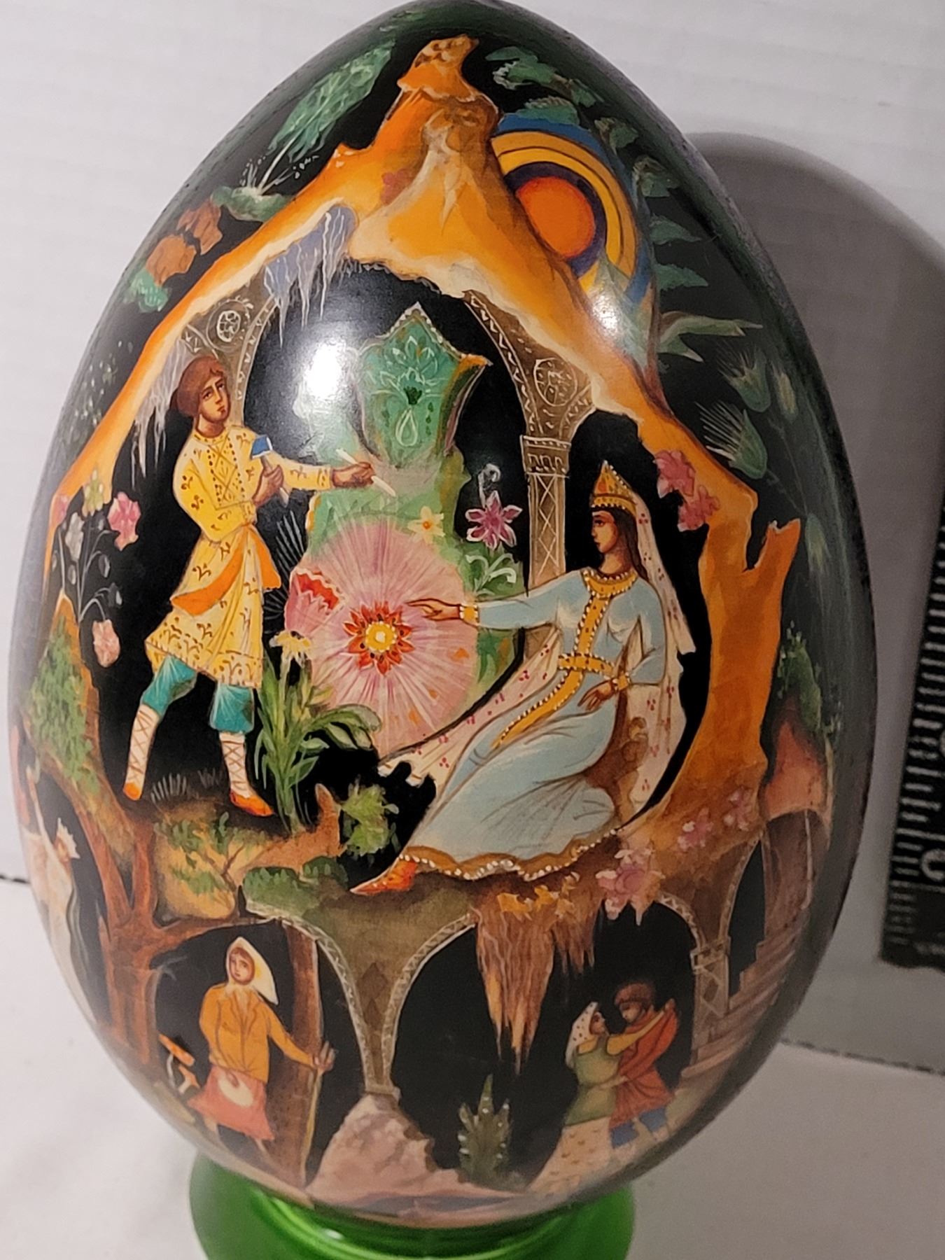 Large Ukrainian wooden egg on Uranium glass stand. Hand painted.