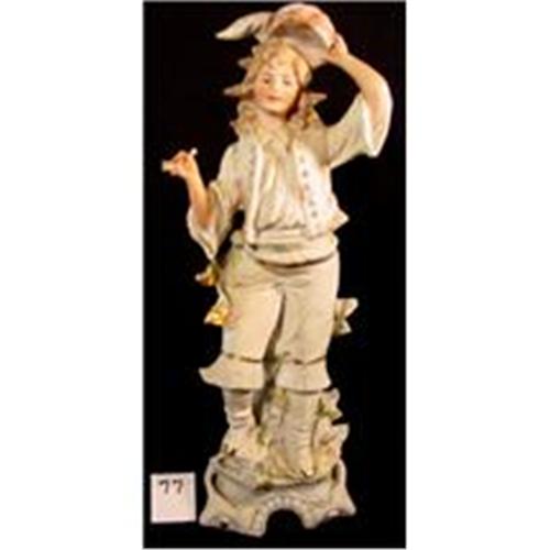 Delicately color tinted and gilt Grafenthal, Thuringia, Germany bisquit porcelain Dandy figure with the manufacturer mark of Unger, Schneider Cie. <BR><BR>Founded in 1861 producing superior figurals in delicate porcelain and handmade with attention to detail. Young lad, superb in period garb, measures a stout 15 5/8 inches high. Holding a pipe in one hand, and tipping his feathered cap in another, with brilliant gold buttons to his otherwise white chest coat, knicker cuffs, belt, boot tips and also accenting his sash tips. He stands upon a rock bridge covered in grape vine. One cluster of grapes exhibits a high lustering with just a hint of opalescent color.<BR><BR>Incised pre-1939 mark with impressed number 8858.<BR><BR>