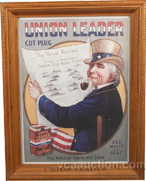 Large Union Leader Cut Plug Paper Sign, "The National Smoke & Chew" in wood embossed frame (recreation) - 36" x 46"