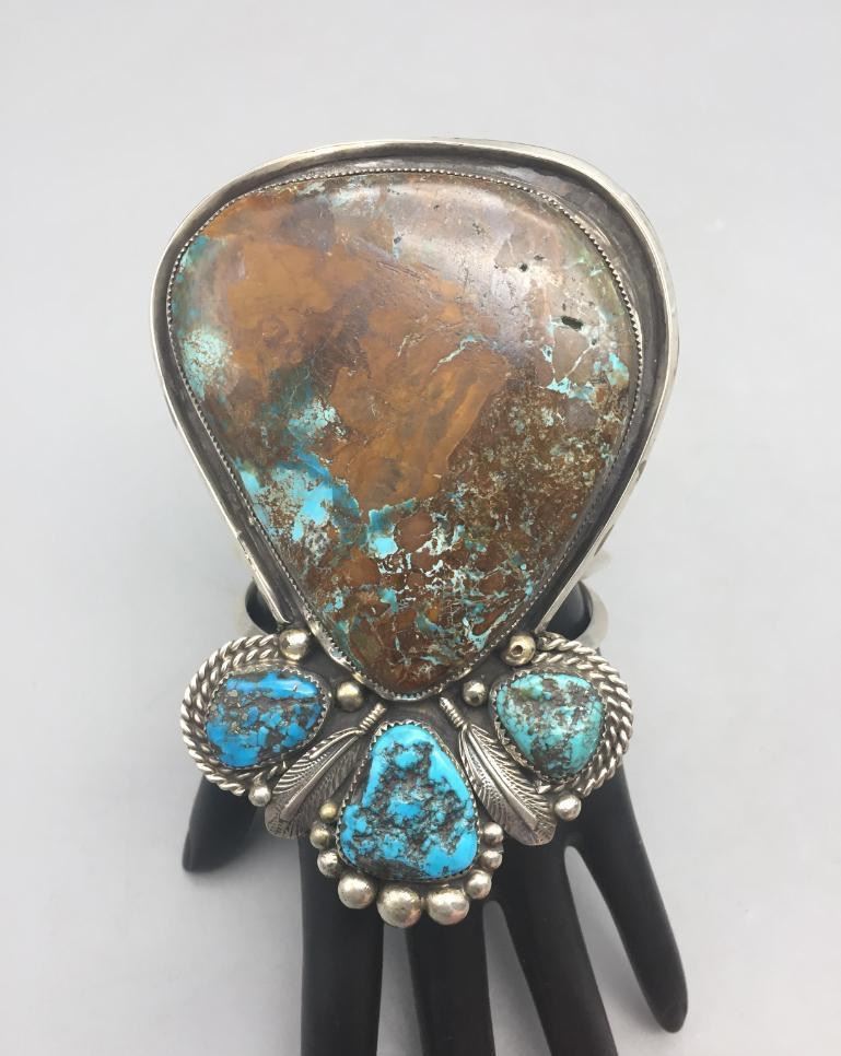 Presented for sale in this lot is this large size and very unique turquoise bracelet featuring a variety of stones, including one large sized one and they are surrounded by intricate sterling silver details. Maker: Hallmarked with a C. Approx. Age: Contemporary. Size: Measures 5-5/8" with a 1" opening, fits a 6-5/8" wrist. It is 4-1/2" wide and weighs 159 grams. Condition: Good for its age, normal wear expected. Please look closely at the pictures - they are an important part of our description. Shipping: There will be a $5 handling, packaging fee for shipping this lot. The actual cost of postage will be added on top of that.