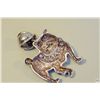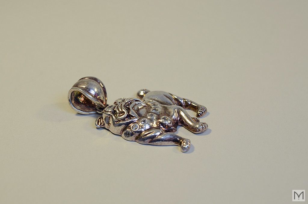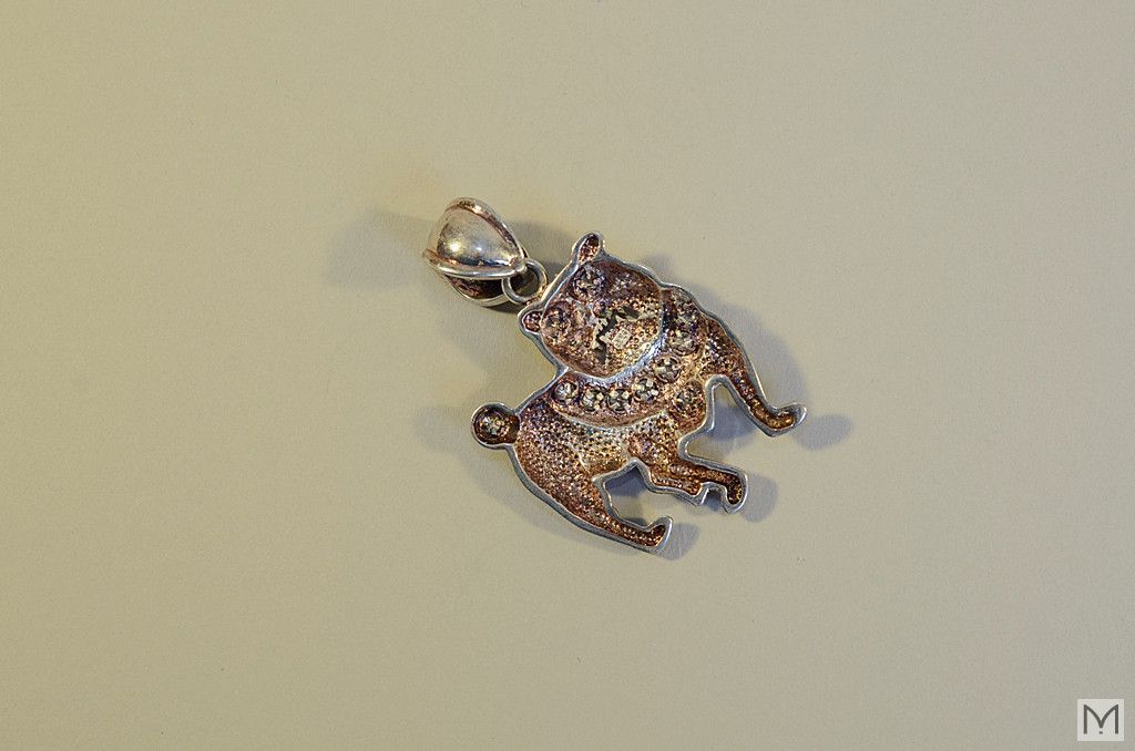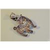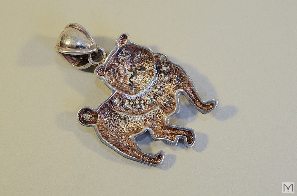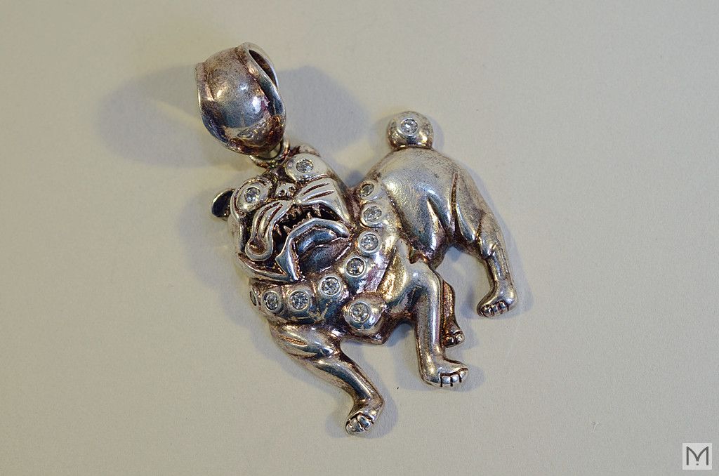 Large, Unusual 'Designer' Dog Pendant - Marked and Stamped: '925'. Set with 12 Faceted Clear Stones. Possibly a pug? Very well made and heavy. Both the pendant and hoop show remnants of an annodized 'pink' patina. Both pieces are also marked '925'. Age uncertain.....