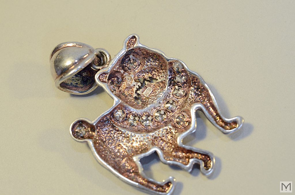 Very fine used condition. Some very minor surface scratches - high areas show some loss of annodized 'pink' patina to reveal more silver. Loop (for chain) is very secure - stones/crystal appear to be original - and securely set.