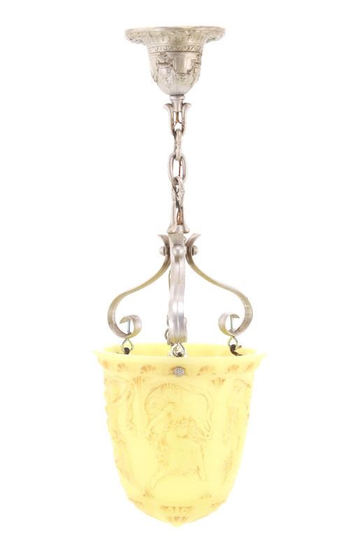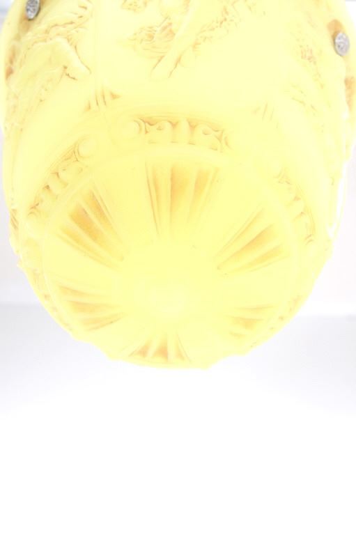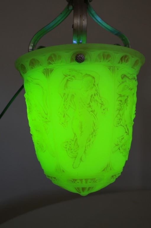 For your consideration is this 19th century Vaseline / Uranium glass hanging light. This large electric hanging lamp displays an impressive piece of thick Uranium glass, showing very detailed images of women doing different poses in flowing dresses around the entirety of the glass. The images are bordered with geometric designs, while the bottom rim houses three metal hooks to connect the glass with the hanging components. The glass shows a cloudy light green color and no makers mark is present on the glass. The glass comes with the original hanging components, with the only parts having been replaced are three screw hooks. The hanging light shows good condition overall with some wear to the glass and the hanging components, and the wires have been severed, but no signs of obvious damage is present. The glass shade measures a bottom diameter of 11 1/2" and a height of 12". The glass shade weighs 11 pounds. The hanging component measures 22 3/4" L x 9 5/8" W and weighs 4 pounds and 2 ounces.
