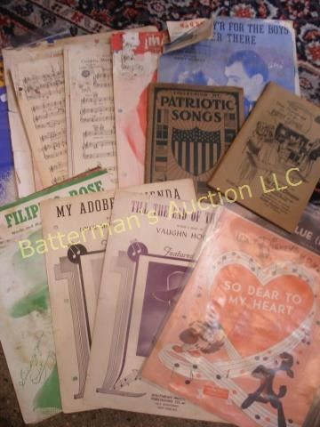 Sheet music and playbills; Western calendars; Mining and Railroad stocks and photos; travel catalogs; world stamps; parts catalogs; personal letters; Civil War battlefield map; matchbooks, product boxes,