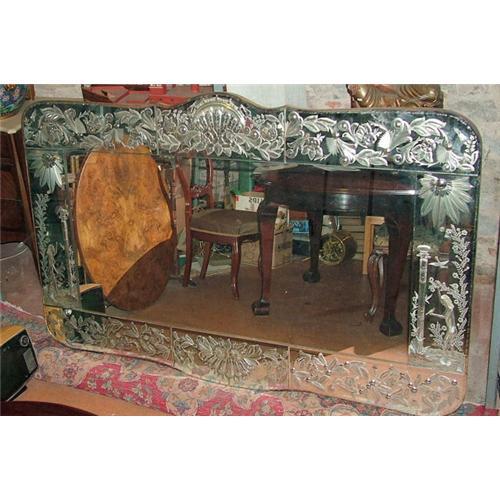 A fantastic Large Venetian Mirror heavily carved on the backside of the crystal and mounted on a wood piece. made about 1920 , and still in excellent conditions , measuring 85 inches wide and 45 inches H. an unusual quality item, in great conditions. Shipping within U.S. $285