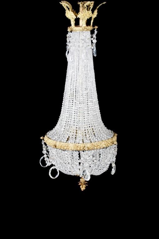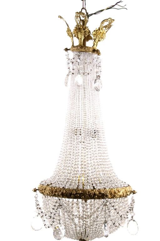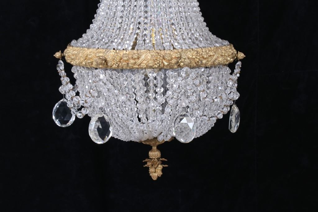 For your consideration is a lovely large Victorian handing crystal chandelier. The chandelier shows an elegant design. The brass is beautifully accented by the network of faceted crystals. The topmost brass features a bow and floral design. The lower brass section shows a popular Victorian fruit motif. The chandelier shows wonderful pendalogues of varying sizes throughout the piece. The chandelier is in good condition. The chord for the chandelier is in good condition. It measures approximately 48” long by 21” round.