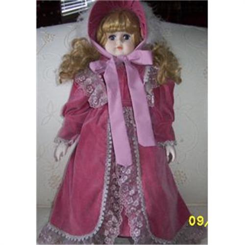 Dressed in rose colored velour and lace trimmed full length Chemise. Her hat is rose velour as well and lined with soft down feathering, her petticoat and bloomers are lace trimmed and made of linen and lastly her boots are brown leather with hard leather bottoms. She has a cloth body, attached are her porcelain hands, feet and head.