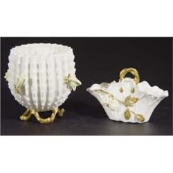 Large Victorian Moore Brothers cactus shaped vase, relief moulded with flowers and a frilled basket with gilt ropetwist handle, marks to bases, largest 16cm high