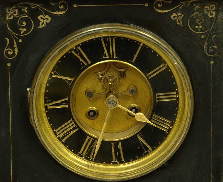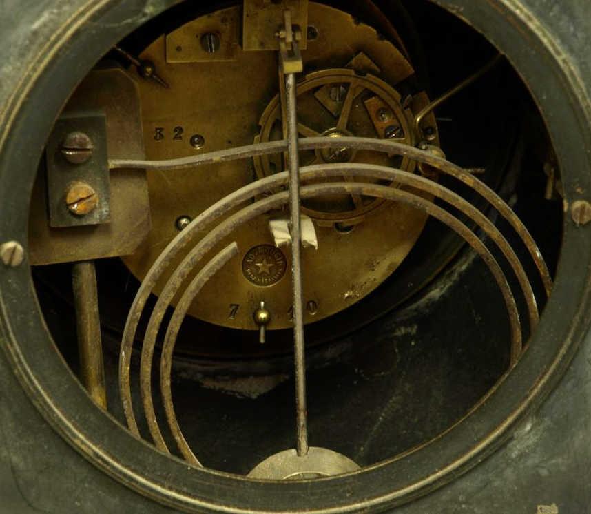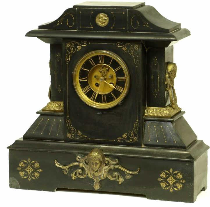 brass mounted with Maiden Ladies and incised carved open escapement and hand painted dial. In need of a good cleaning. Measures 18" tall X 19" wide.
