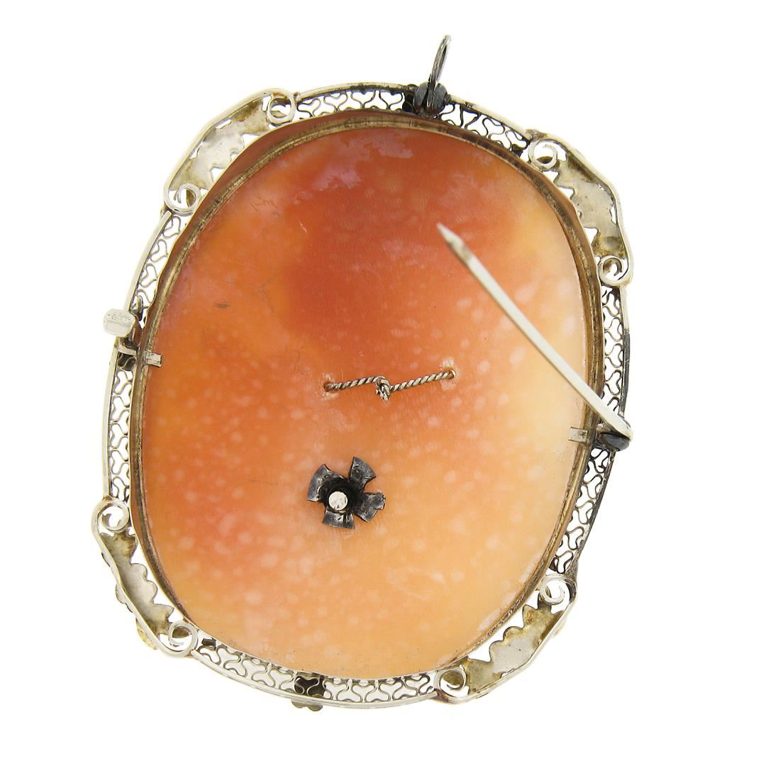 Large Vintage 14K Gold Carved Shell Cameo w/ Diamond Filigree Pin Brooch Pendant