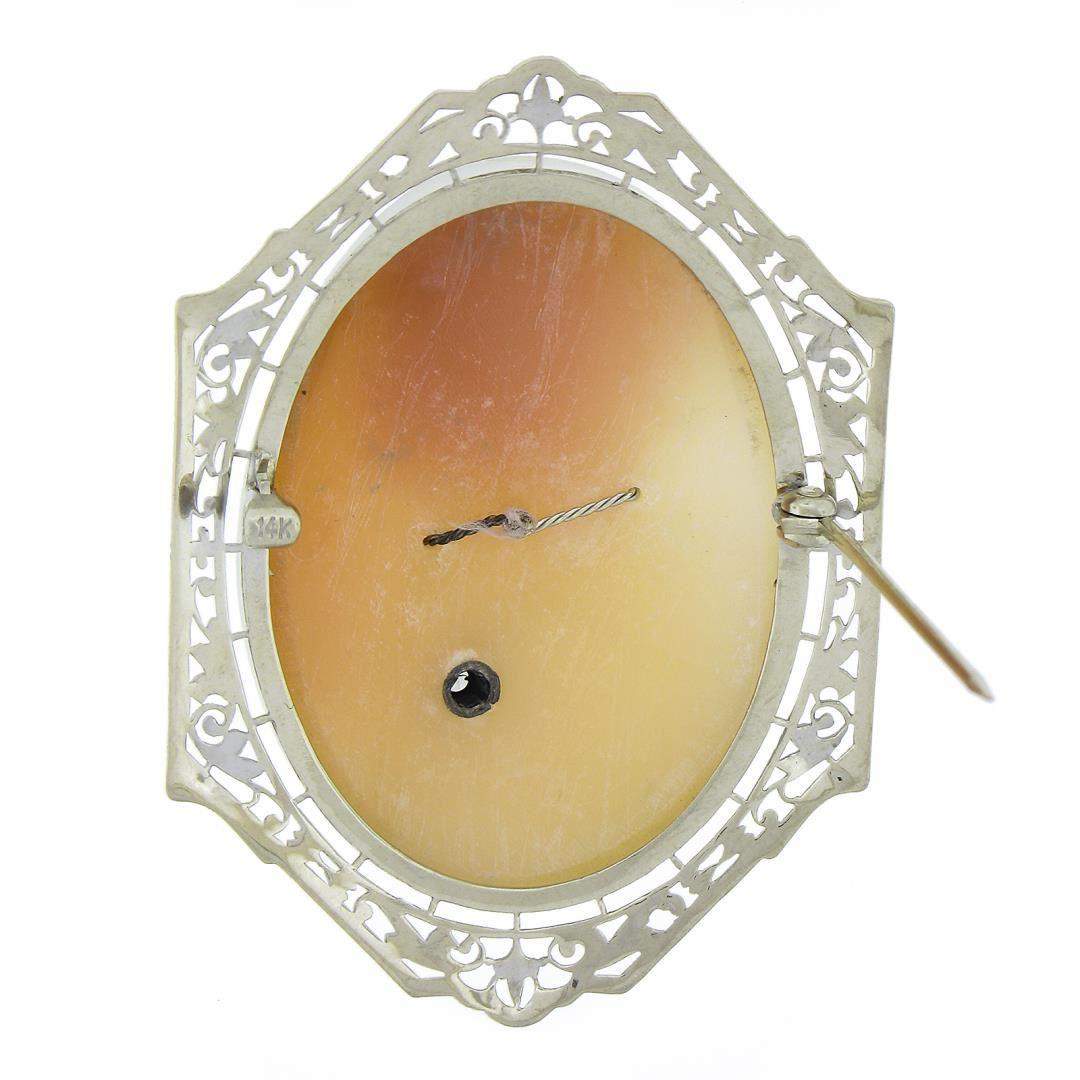 Large Vintage 14K White Gold Carved Shell Cameo w/ Diamond Filigree Pin Brooch