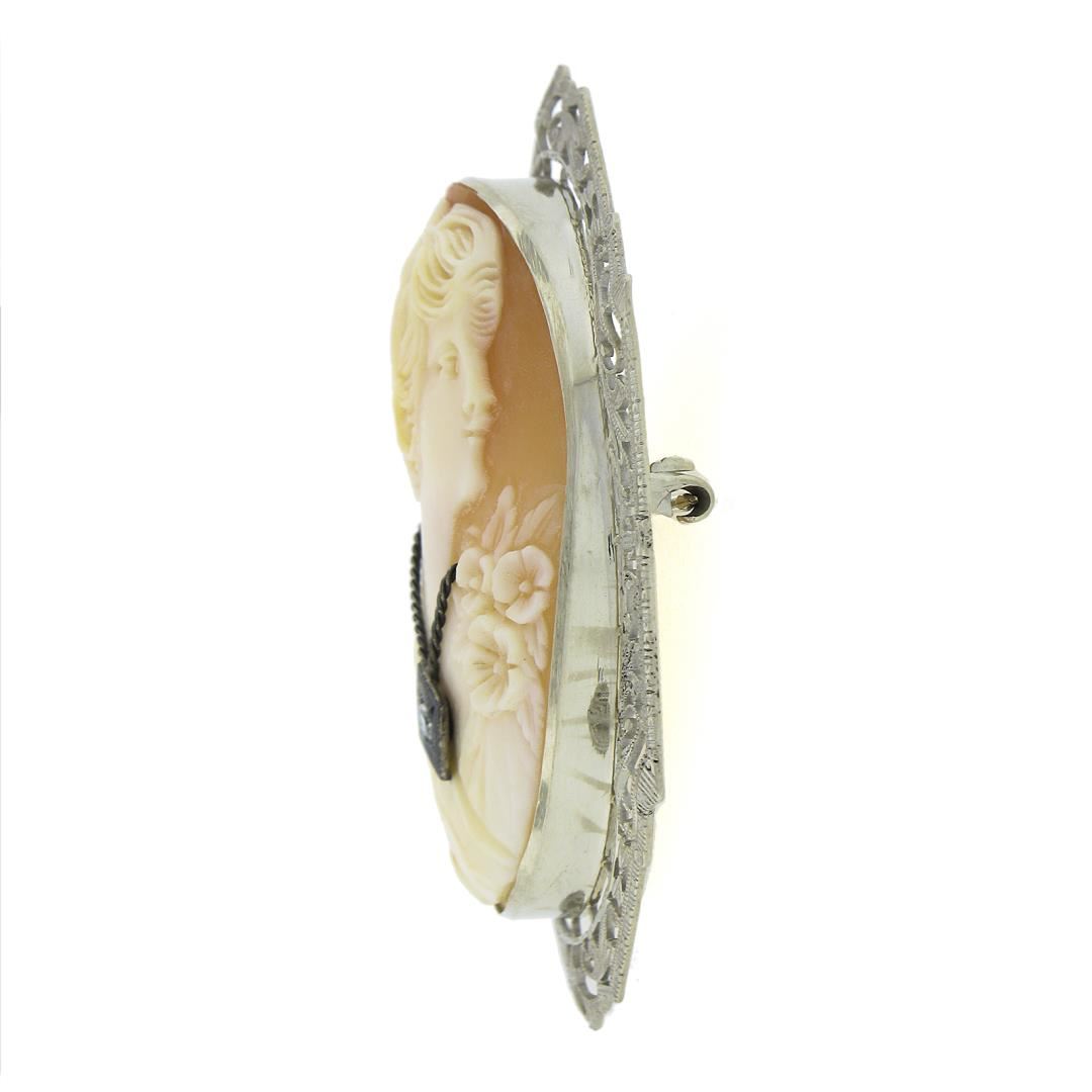 A vintage solid 14k white gold brooch, with 1 oval carved cameo shell (34.8x25.9mm ), and 1 old single cut natural diamond (G - SI2 ; 0.03ct). Measures 46.2x33.4mm and weighs a total of 9.72 grams.