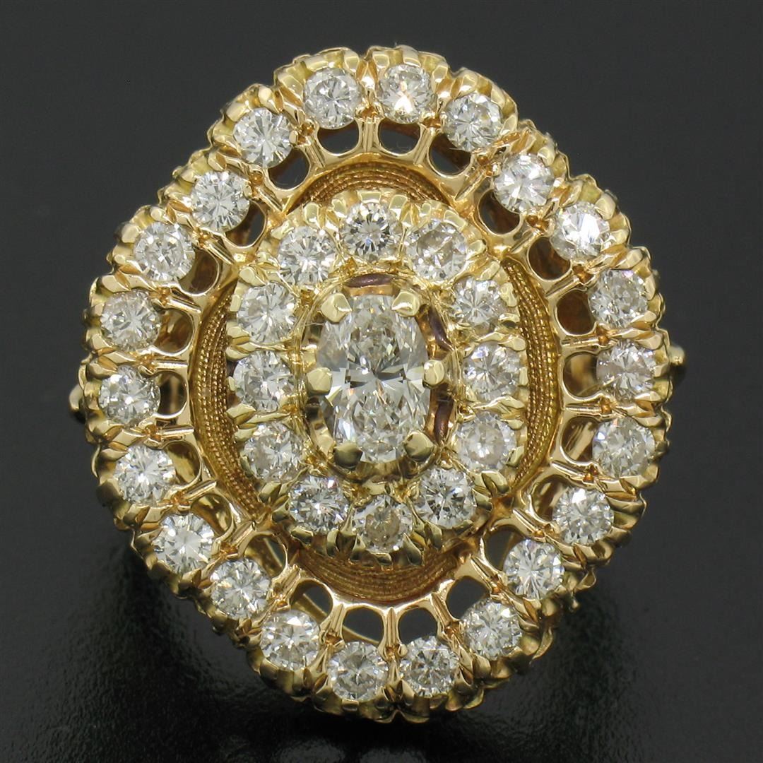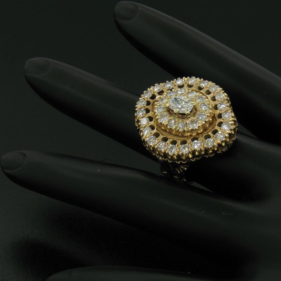 A vintage solid 14k yellow gold large flower cocktail ring, with 1 oval cut natural diamond (G- VS1; 0.50ct), surrounded with 34 round brilliant cut natural diamonds (F/G - SI1/SI2; 1.70ctw). The ring is size 5.0, weighs a total of 12.70 grams, and measures 25.0mm wide.