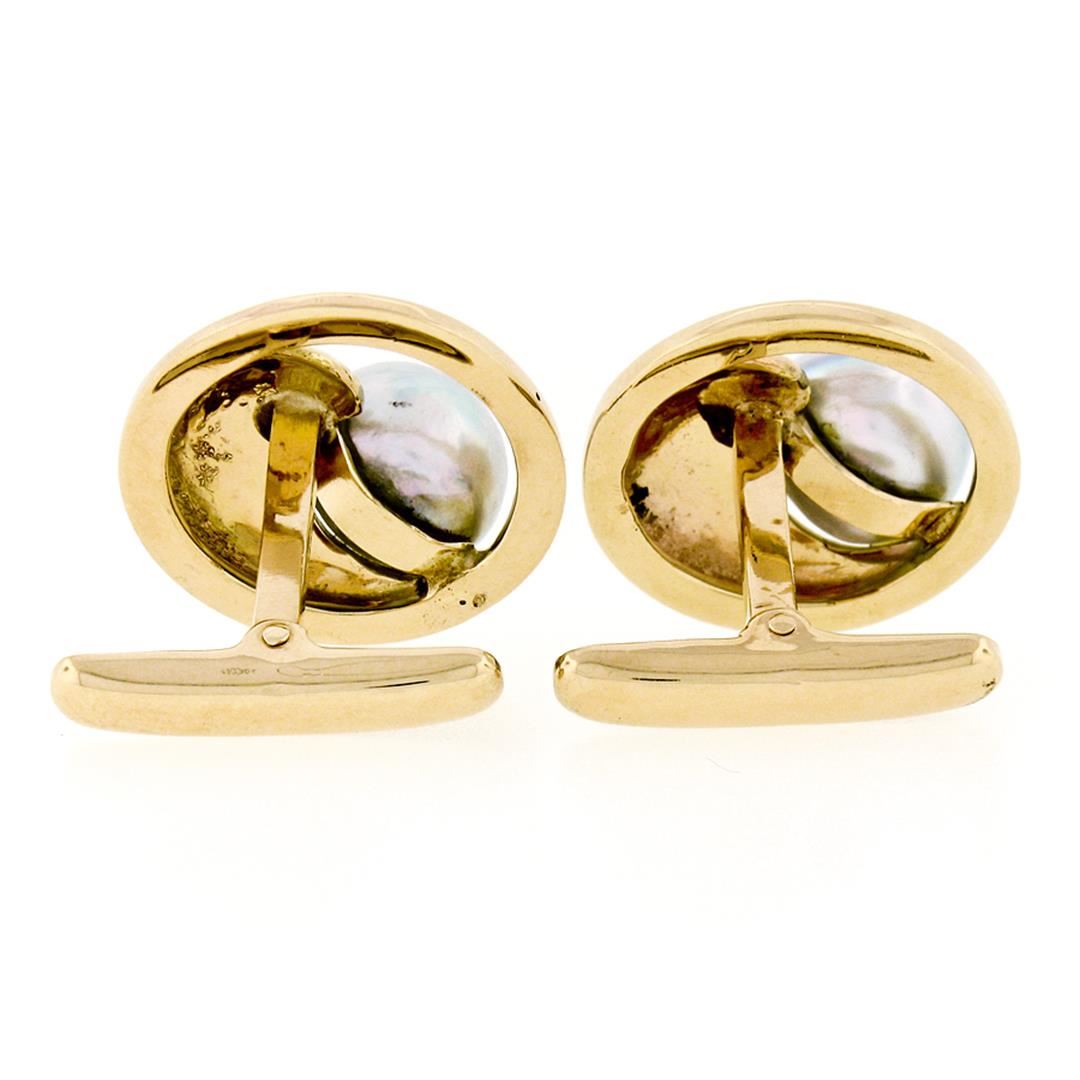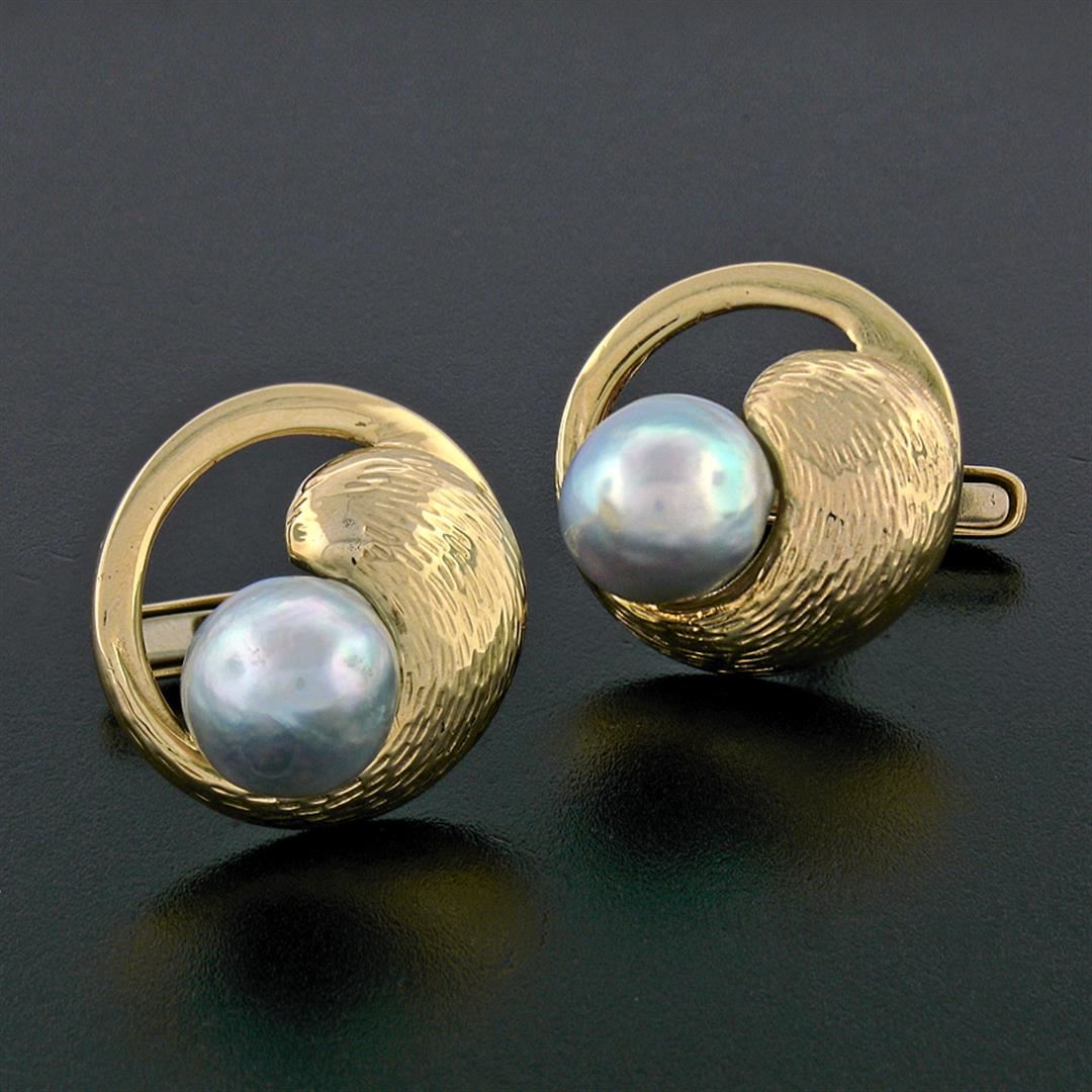 A vintage solide 14k yellow gold large cufflinks, featuring 2 round shape nautral cultured pearls (10.75mm ). These cuff links have a swivel design with a clearance of 12.80mm, weigh a total of 19.52 grams, and the front panels measure 20.85mm in diameter.