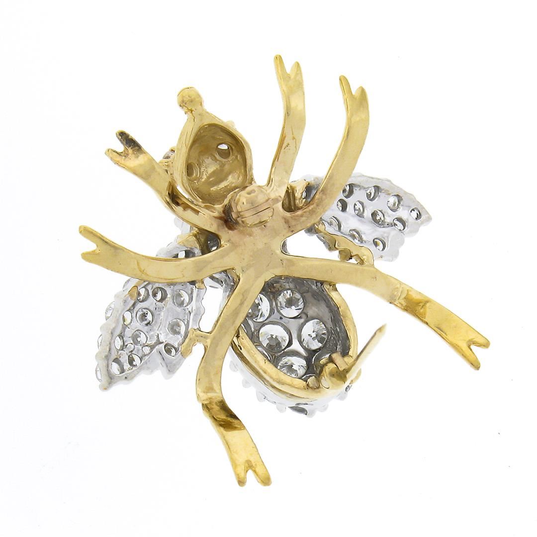 A vintage solid 14k yellow and white gold bee brooch, with 49 round brilliant cut natural diamonds (G/H - VS1/VS2; 3.0ctw). Measures 30.50x31.90mm and weighs a total of 10.10 grams.
