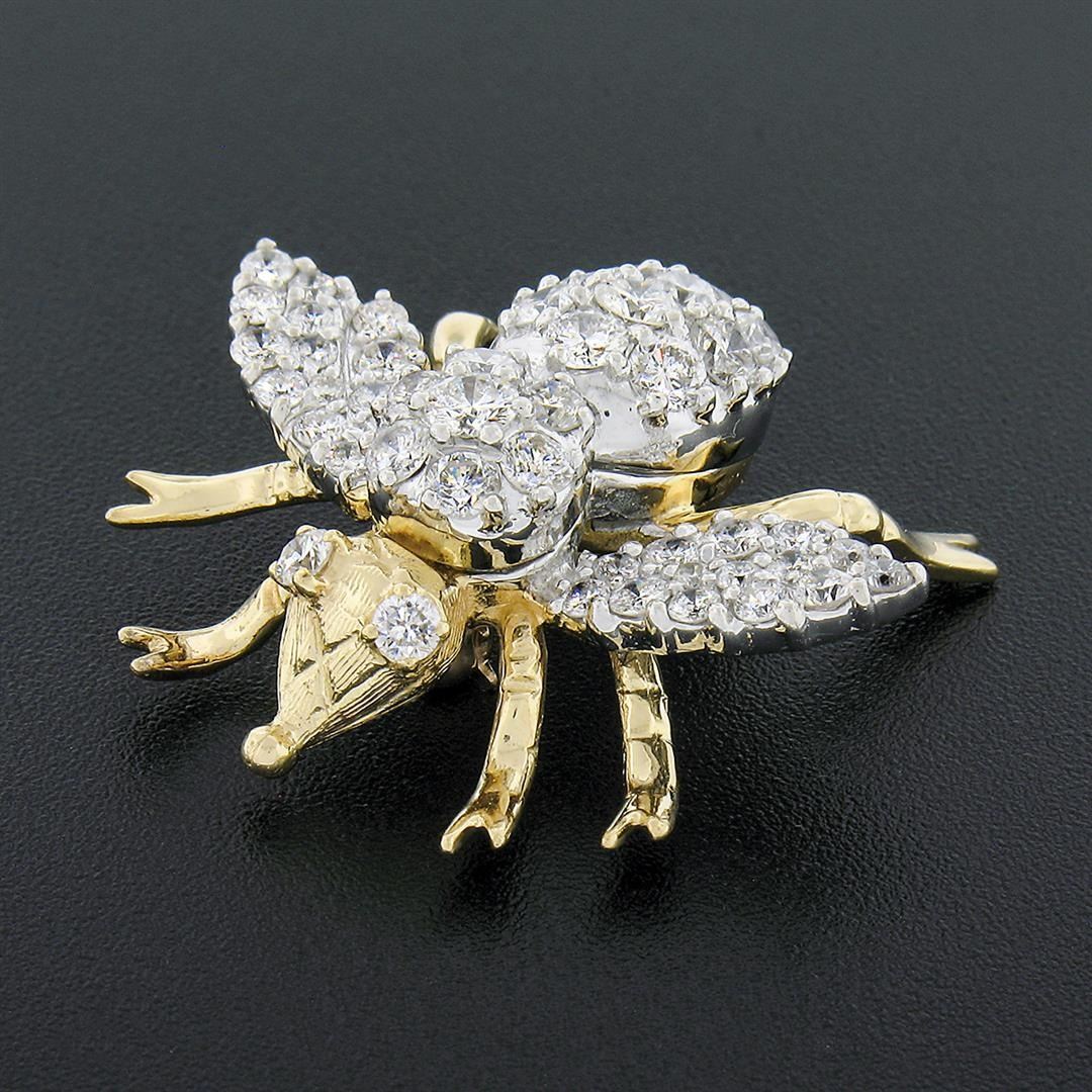 A vintage solid 14k yellow and white gold bee brooch, with 49 round brilliant cut natural diamonds (G/H - VS1/VS2; 3.0ctw). Measures 30.50x31.90mm and weighs a total of 10.10 grams.