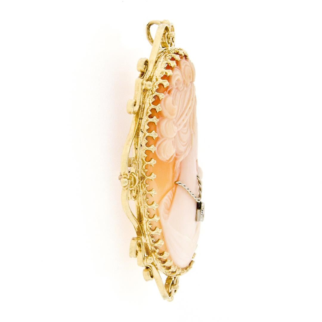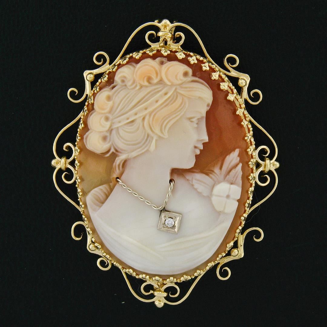 A vintage solid 14k yellow and white gold brooch pendant, with oval shape carved shell cameo (44.20x33.80mm), and 1 round single cut natural diamond (F - SI1 ; 0.03ct). Measures 56.20x44.90mm and weighs a total of 15.77 grams.