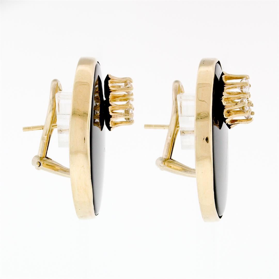 A vintage solid 14k yellow gold button earrings, with 2 round cabochon cut natural black onyx (24.40mm), and 6 old transitional cut natural diamonds (G/H - VS1/VS2 ; 0.60ctw). The earrings measure approximately 26.0mm in diameter and weigh a total of 20.26 grams.