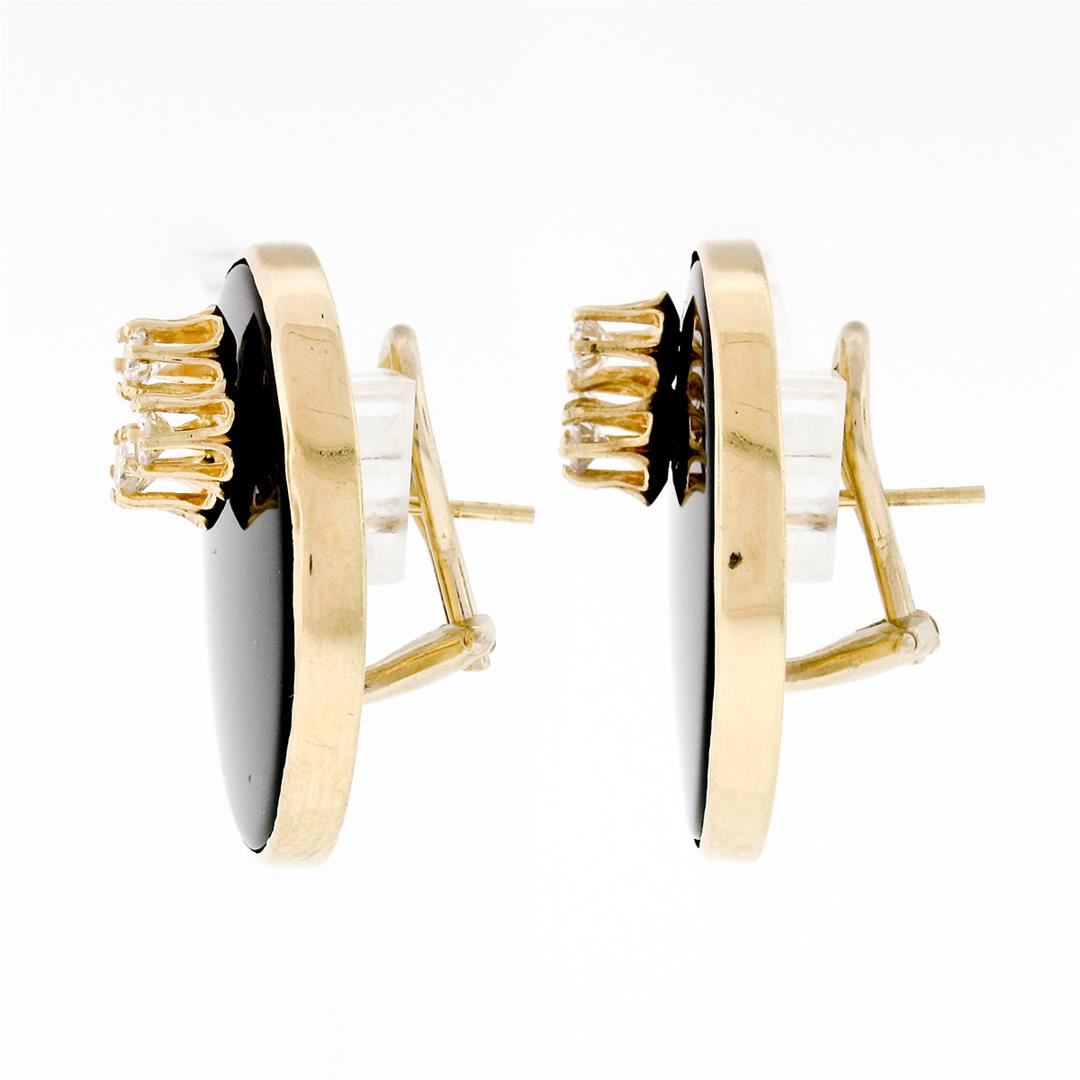 A vintage solid 14k yellow gold button earrings, with 2 round cabochon cut natural black onyx (24.40mm), and 6 old transitional cut natural diamonds (G/H - VS1/VS2 ; 0.60ctw). The earrings measure approximately 26.0mm in diameter and weigh a total of 20.26 grams.