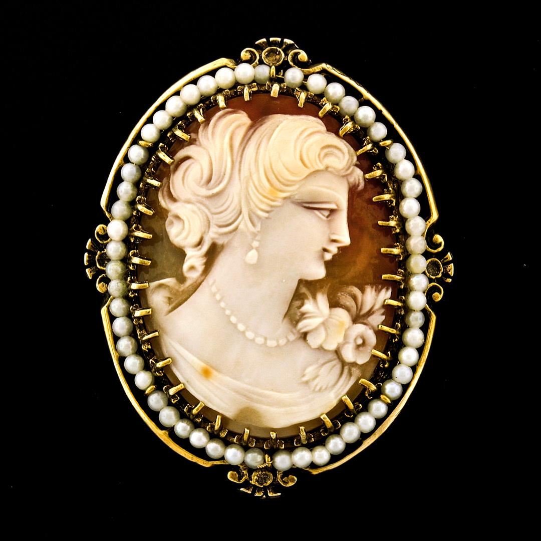A vintage solid 14k yellow gold pin brooch, with 1 oval shape natural carved shell cameo (35.50x27.50mm), surrounded with a halo of 55 round shape natural pearls (2.0mm). Measures 48x38.50mm and weighs a total of 12.78 grams.