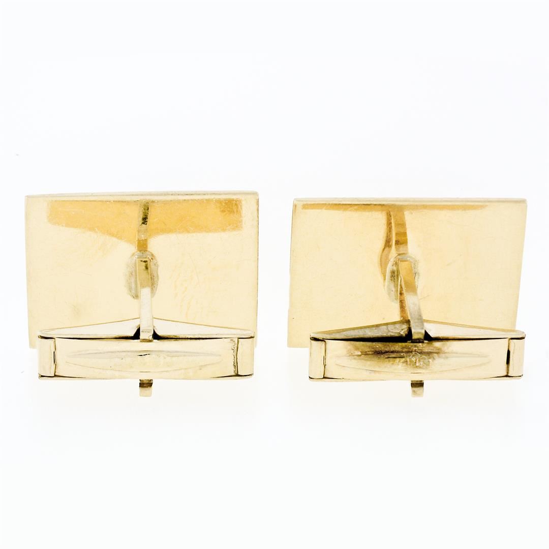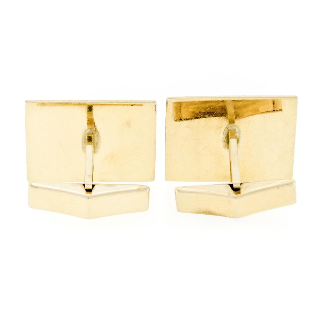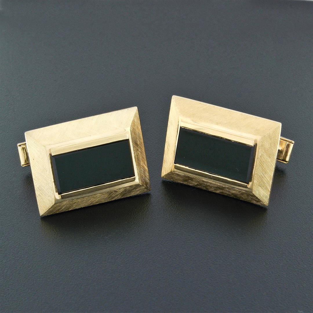 A vintage solid 14k yellow gold cufflinks, with 2 rectangular flat natural black onyx (15.15x7.50mm). These cuff links have a swivel design with a clearance of 12mm, weigh a total of 15.47 grams, and the front panels measure 22x16.60mm.