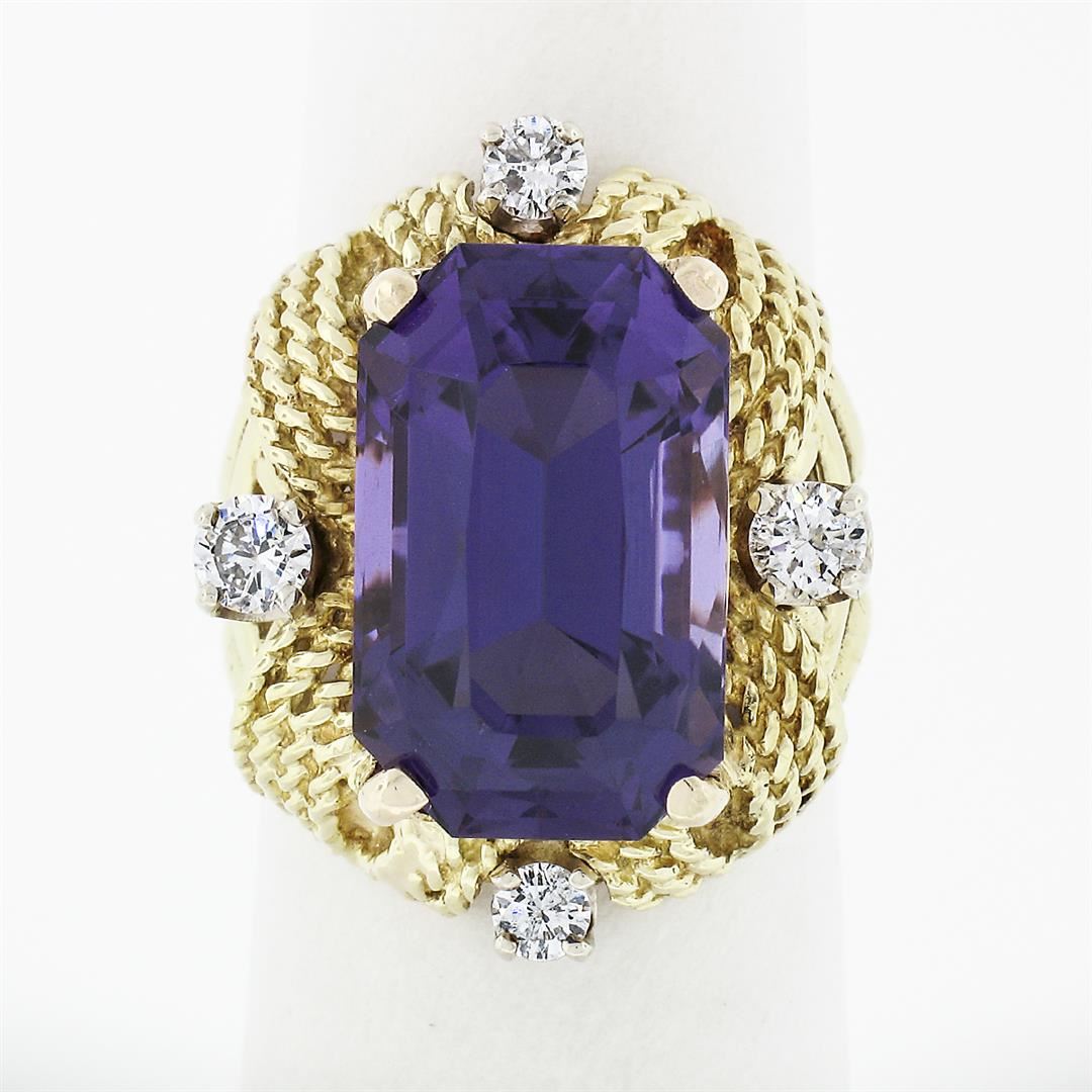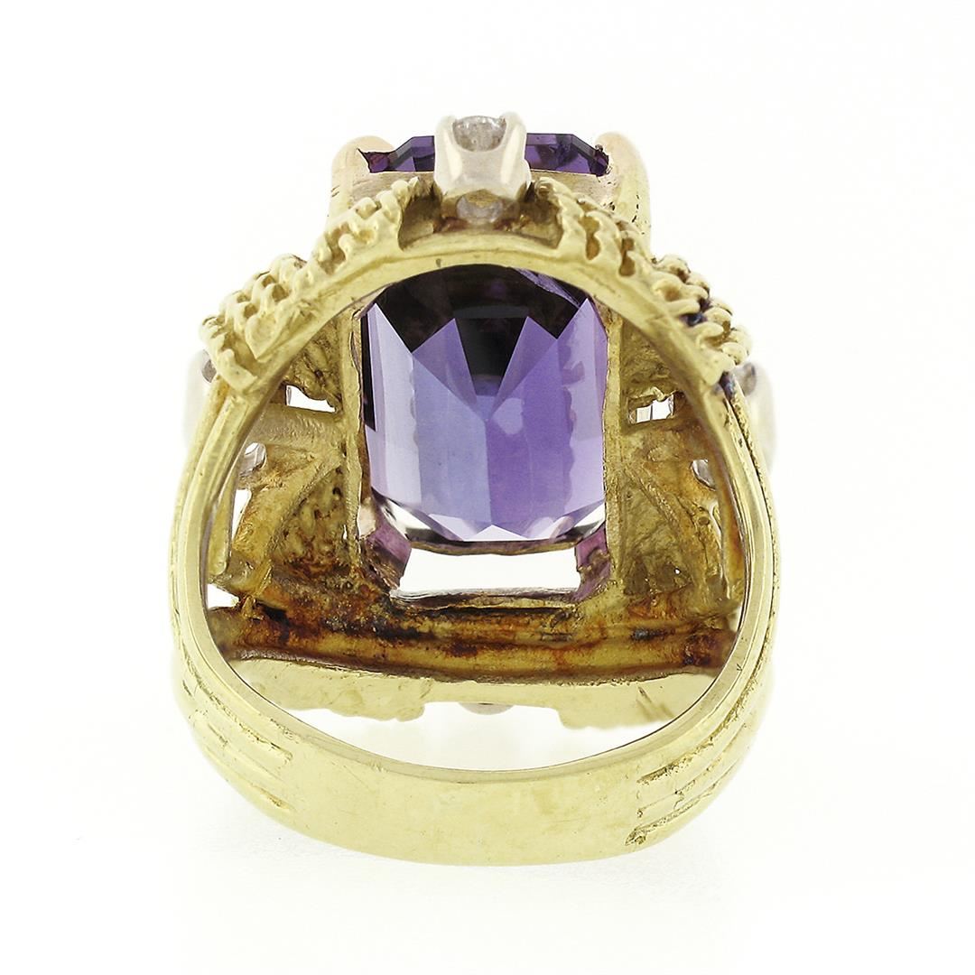 A vintage solid 18k yellow gold cocktail ring, with 1 unique shape natural amethyst (16.5x10.4mm - 9.0ct ), surrounded with 4 round brilliant cut natural diamonds (G/H - VS2/SI1; 0.50ctw). The ring is size 6, weighs a total of 12.67 grams, and measures 24.1mm wide.